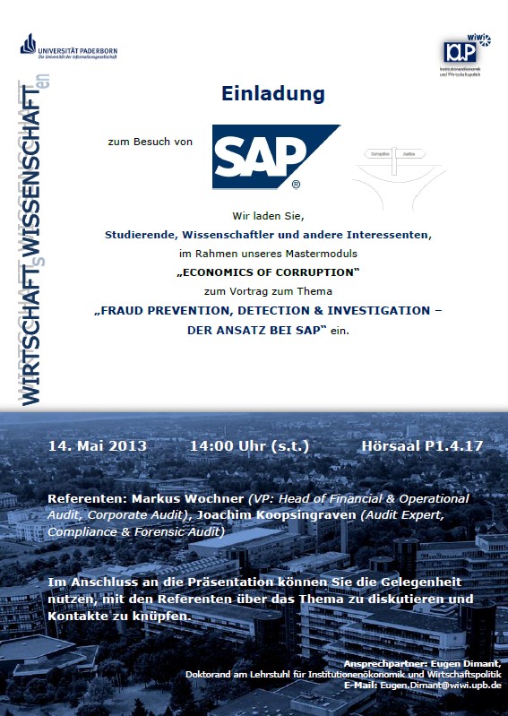 Markus Wochner (VP: Head of Financial & Operational Audit, Corporate Audit) und Joachim Koopsingraven (Audit Expert, Compliance & Forensic Audit) von SAP referieren am 14.5.2013 um 14.00 Uhr (s. t.) im Hörsaal P1.4.17 zum Thema "Fraud Prevention, Detextion & Investigation – Der Ansatz bei SAP". Der Vortrag findet im Rahmen des Mastermoduls "Economics of Corruption" statt und wird vom Lehrstuhl für Institutionenökonomik und Wirtschaftspolitik organisiert.
