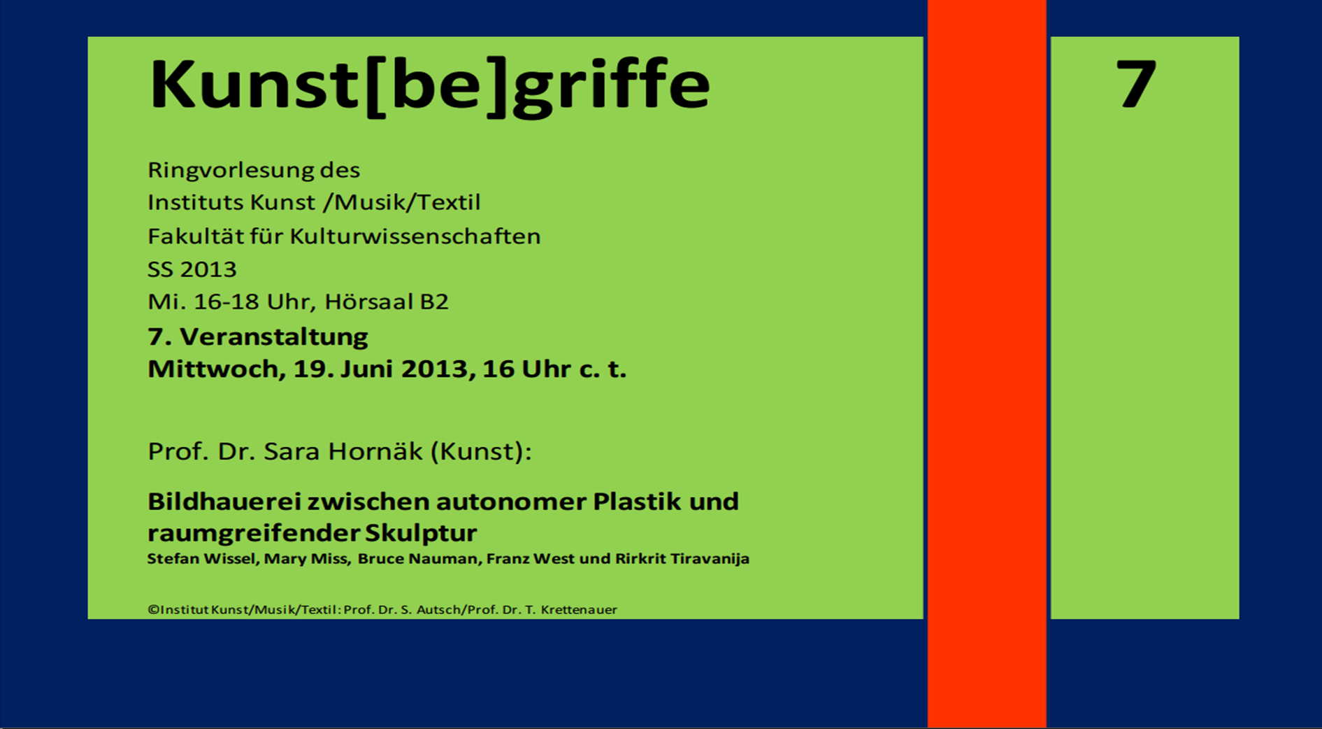Anhand einer Skulptur von Stefan Wissel wirft der Vortrag die Frage nach dem Verhältnis von Skulptur und Installation auf, an einem Werk von Mary Miss wird der mit der "Befreiung" vom Sockel einhergehende Wandel von Horizontale zu Vertikale thematisiert. Auf welche Weise die begehbaren Skulpturen von Bruce Nauman veränderte Raumerlebnisse ermöglichen, wie Franz West die Benutzbarkeit des plastischen Objektes in den Vordergrund rückt und inwiefern Rirkrit Tiranavija soziale Handlungsräume konstruiert, untersucht Sara Hornäk, um am Beispiel dieser fünf Positionen, die auf ganz verschiedene Weisen bisherige Begriffe der Skulptur erweitern, gattungspezifische Abgrenzungsversuche und Dichotomien zur Diskussion zu stellen.