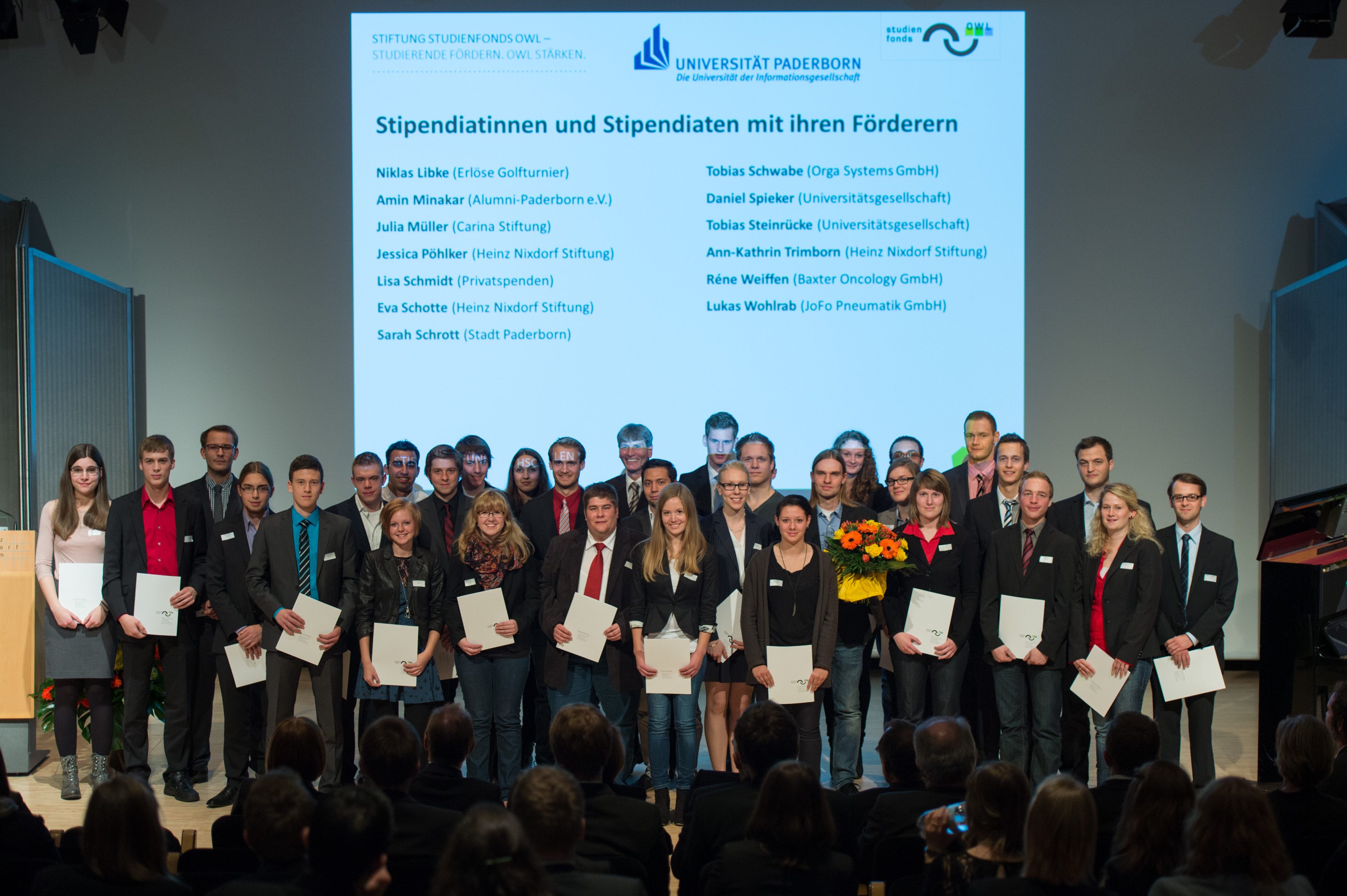 Mittlerweile vergibt die Stiftung Studienfonds OWL seit nunmehr acht Jahren Stipendien an leistungsstarke, sozial engagierte und bedürftige Studierende der fünf staatlichen Hochschulen in Ostwestfalen-Lippe. Die Universitäten Bielefeld und Paderborn, die Fachhochschule Bielefeld und die Hochschule Ostwestfalen-Lippe sowie die Hochschule für Musik Detmold partizipieren an dem inzwischen bundesweiten Förderprogramm „Deutschlandstipendium“, in dem sich Bund, Hochschulen und private Förderer gemeinsam engagieren, eine für Deutschland neuartige Stipendienkultur aufbauen, Studierende die Attraktivität von OWL verdeutlichen und somit langfristig dem Fachkräftemangel in den Regionen entgegenwirken.