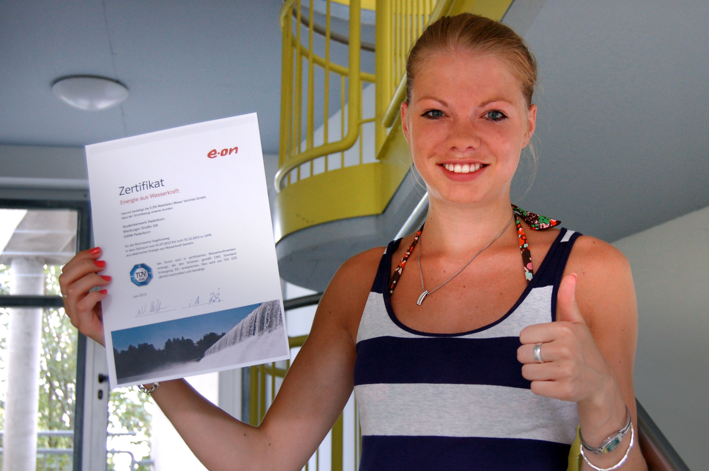 Seit dem 1. Juli 2013 haben die Wohnanlagen des Studentenwerkes umgeschaltet – auf Energie aus Wasserkraft. "Mit 1.045 Wohnplätzen können wir damit einen großen Beitrag in Bezug auf Nachhaltigkeit leisten," so Carsten Walther, der Geschäftsführer des Studentenwerkes. "Beispielsweise sparen wir damit den Ausstoß von 438 Tonnen CO2 ein". Neben dem rein ökologischen Effekt sieht er noch einen weiteren Mehrwert: "Als sozialer Förderer für Studierende sind wir für junge Menschen da, die nach ihrem Studium verantwortungsvolle Aufgaben in unserer Gesellschaft wahrnehmen werden. Diesen während ihrer Ausbildung das Thema "Nachhaltigkeit" nahezubringen, ist mir sehr wichtig."
