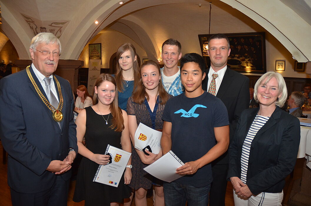 Foto: Bürgermeister Heinz Paus ehrte an dem Abend eine ganze Reihe von Schülern, hier mit den Abiturienten des Goerdeler-Gymnasiums (v. l.) Johanna Wübbeke, Christina Mersch, Lisa von Glahn, Lucas Wiens, Alexander Nguyen, Schulpflegschaftsvorsitzender
