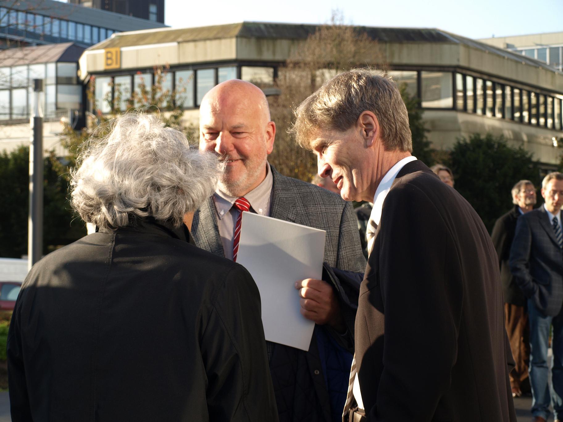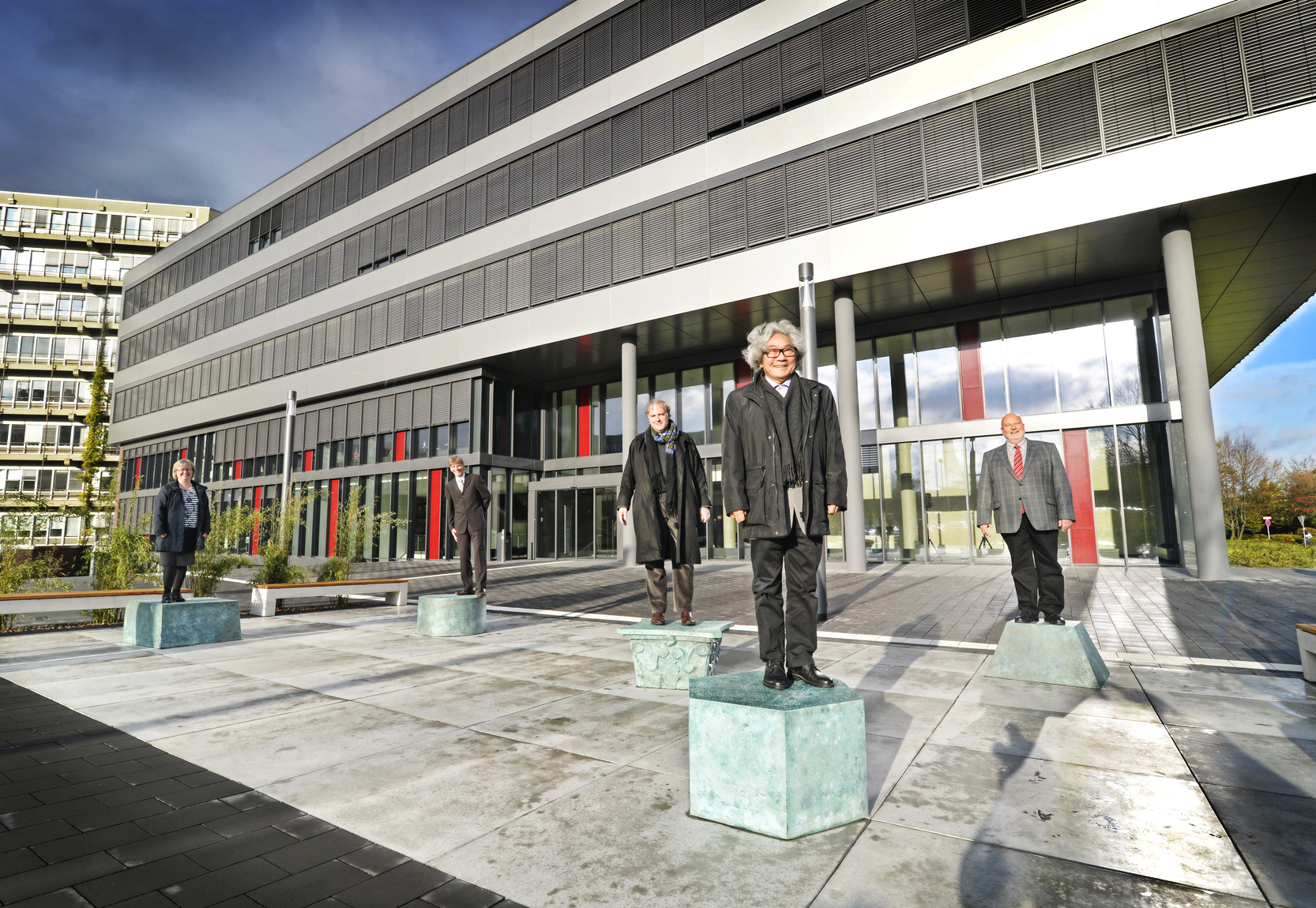 Schon zahlreich bestaunt, wurde das Kunstwerk am Dienstag, 5. November, offiziell eingeweiht. Im Beisein des Künstlers Prof. Yuji Takeoka sowie von Dr. Friedrich Meschede, Direktor der Kunsthalle Bielefeld, Uni-Präsident Prof. Dr. Nikolaus Risch und zahlreichen Besucherinnen und Besuchern übergab Heinrich Micus, Leiter der Niederlassung Bielefeld des Bau- und Liegenschaftsbetriebs, das Kunstwerk nun offiziell an die Universität.