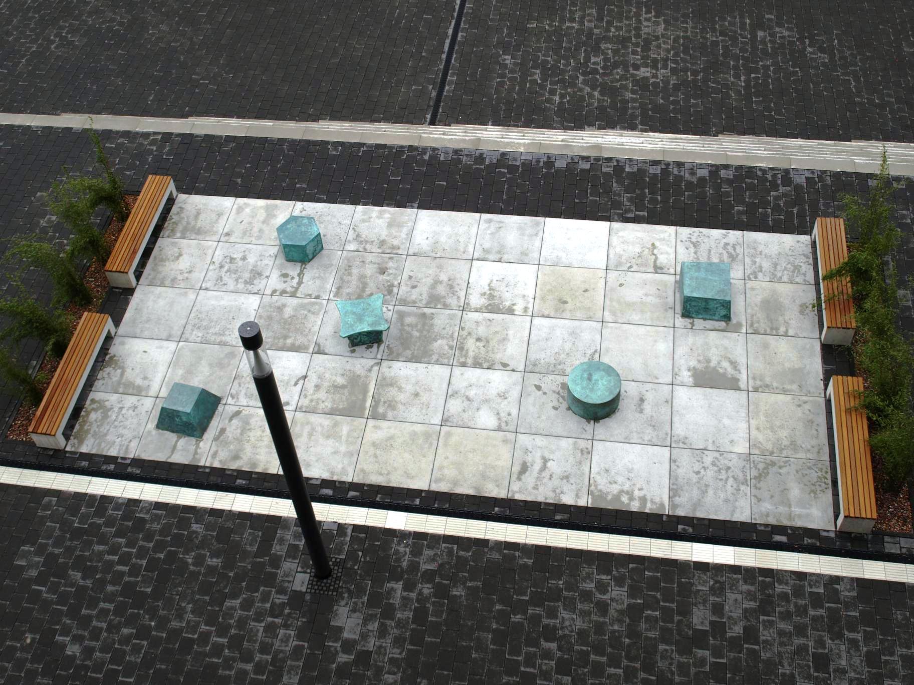Auf dem Vorplatz des neu errichteten Gebäude Q lädt die begehbare Komposition aus fünf flachen Bronzeskulpturen auf einer Fläche von 12 x 6 Metern zum Verweilen ein. Dabei repräsentiert je eine Skulptur die an der Universität Paderborn vertretenen Fakultäten, sodass diese im Kollektiv eine Einheit bilden. Das Arbeitsmaterial Bronze wurde bewusst verwendet: Es verkörpere die einem Fundament ähnliche Dauer und Standfestigkeit der Universität. Die Gestalt der fünf flachen Bronzeskulpturen ist bis auf eine Ausnahme an geometrische Grundformen angelehnt. Welche Skulptur dabei welche Fakultät darstellt, ist dem Betrachter überlassen. In seinem Grußwort erläuterte Prof Dr. Nikolaus Risch seine Zuordnung der Bronzeskulpturen zu den jeweiligen Fakultäten und sorgte so für schmunzelnde Gesichter. Mit einer Verbeugung, typisch asiatisch, bedankte sich Risch bei dem Künstler und den Verantwortlichen für das „großartige Geschenk“ und betonte, dass dieser Bereich des Campus ein neuer, schöner Haupteingang sei.