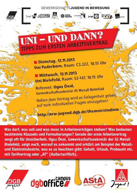 Bei euch naht bald der Studienabschluss, ihr jobbt neben der Uni oder/ und in den Semesterferien? Wer arbeitet, sollte auch in Sachen Arbeitsverträge einige Kenntnisse haben, um kein böses Erwachen zu erleben. Einen Überblick über die wichtigsten Fakten bekommt ihr auf unserer Veranstaltung „Tipps zum ersten Arbeitsvertrag“, zu der wir (DGB Campus Office Bielefeld, DGB Campus Office Paderborn und IG Metall Jugend in Kooperation mit dem AStA vor Ort) euch herzlich einladen.