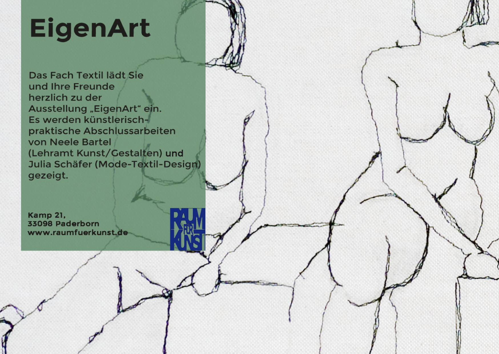 Neele Bartel zeigt neben der klassischen Aktzeichnung in Bleistift auch eine ins Textile transformierte Zeichnung mit der Nähmaschine. Darüber hinaus schafft sie durch die Kombination aus Siebdruck und Maschinenstickerei neue Ausdrucks-formen. Besonders hierbei sind die Zeichnungen aus ihrer eigenen Kindheit, die sie ebenso in ihre Arbeit einfließen lässt.