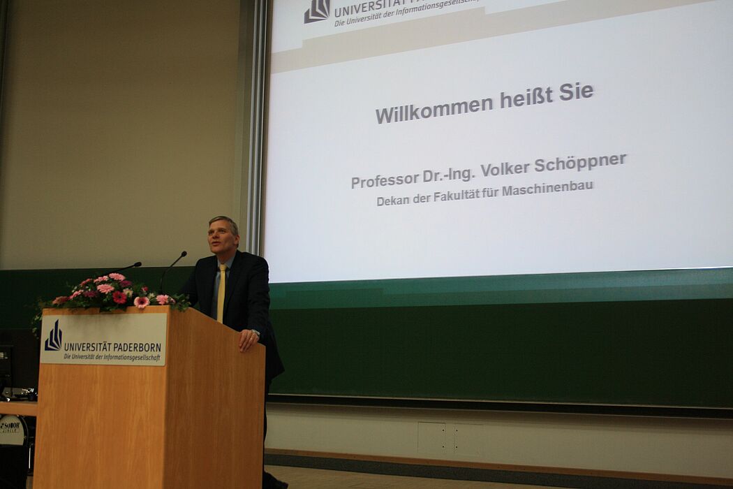 Der Dekan, Prof. Dr.-Ing. Volker Schöppner, begrüßte die Absolventinnen und Absolventen, die in Begleitung ihrer Familien und Freunde gekommen waren. „Auch in diesem Jahr entlässt die Fakultät wieder hervorragend ausgebildete Absolventen in die Berufswelt. Ergreifen Sie die Chance, einen Arbeitsplatz mit faszinierenden Perspektiven zu finden.“