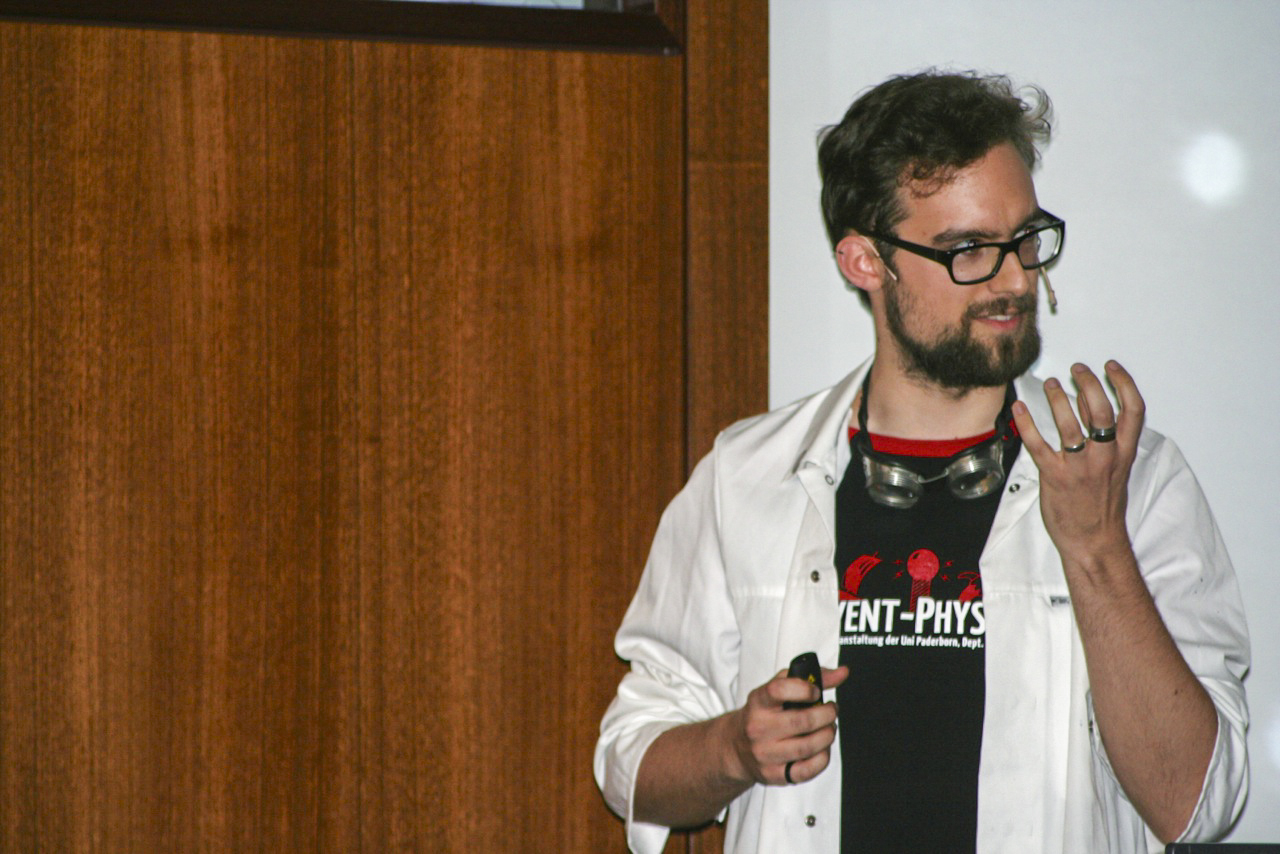 „Bühne frei!“ hieß es dann für den Paderborner Event-Physiker Johannes Pauly, der seine Forschung im Bereich der Nanostrukturierung und Analyse vorstellte. Im „Dialog“ zwischen dem „Meister“ und dem „Laborknecht Igor“ stritt er mit sich selbst über seine Arbeit und die immer wieder auftretenden Hindernisse und Probleme. Er beendete seinen kurzen Auftritt mit dem Titel seinen Slams: „Mein Name ist Physik, …!“.