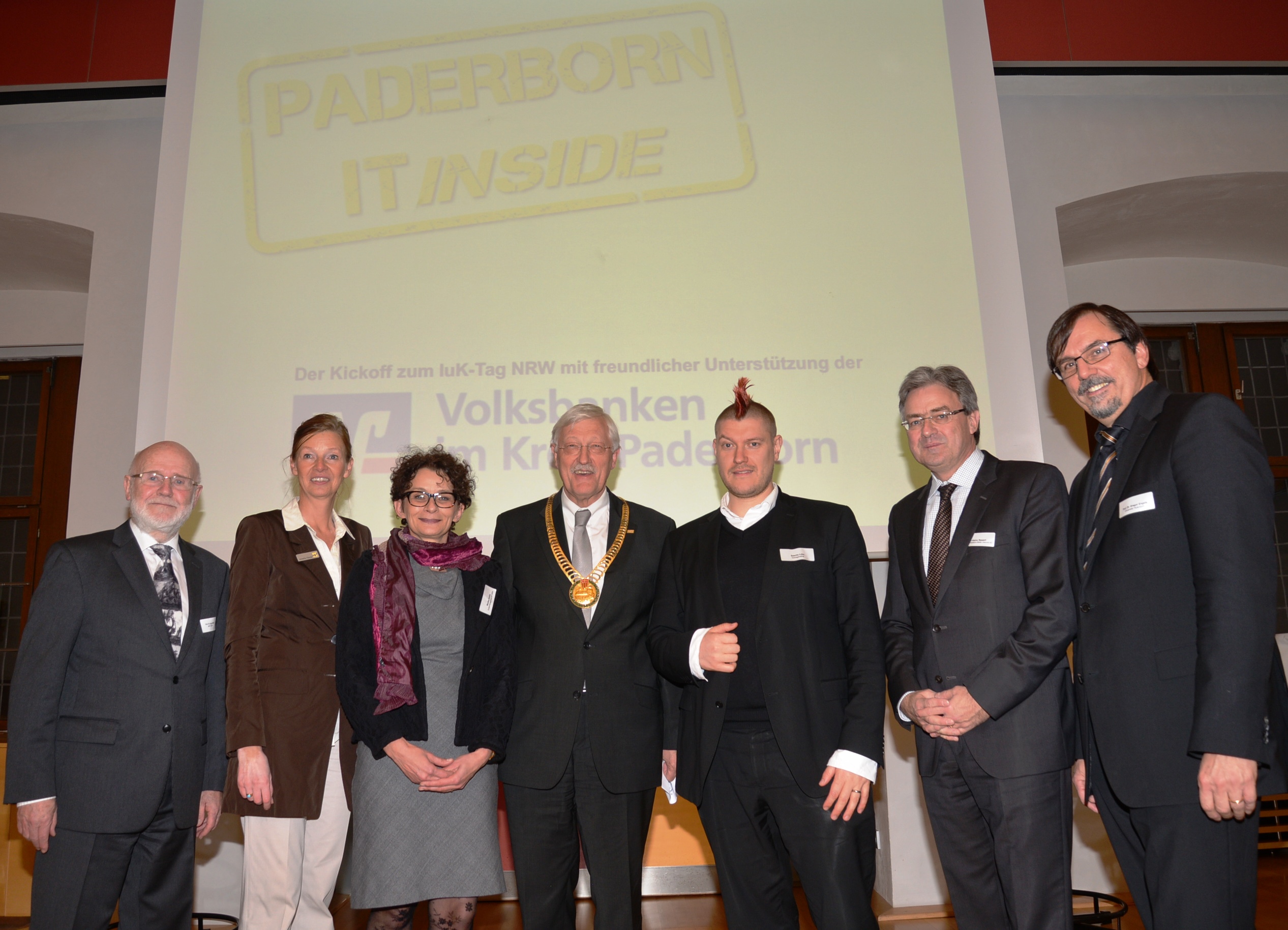 "IT Inside" oder auch "Lobo inside". Das war gestern das prägende Motto des Empfangsabends der Wirtschaftsförderung (WFG) und Universität Paderborn. Die Vorabend-Veranstaltung zum 4. Tag der Informations- und Kommunikationswirtschaft versammelte IT-Akteure aus ganz NRW und darüber hinaus zum gemeinsamen Austausch. Auch die starke Stellung der lokalen IT-Branche sollte damit weiter gefördert werden. Der populäre Spiegel-Online-Kolumnist, Autor und Blogger Sascha Lobo sorgte dabei mit seinem Gastvortrag für einen spannenden Einblick in die Zukunft der Informationsgesellschaft. Über 150 IT-Experten folgten im großen Rathaussaal seinen Thesen zur Entwicklung des Internets und der Sozialen Medien, die in einer angeregten Diskussion mündeten. Bürgermeister Heinz Paus präsentierte auch die Einleger-Broschüre "Paderborn – IT inside", die aussagekräftig für den IT-Standort Paderborn werben soll. Die Veranstaltung ist mit freundlicher Unterstützung der Volksbanken in Paderborn realisiert worden.
