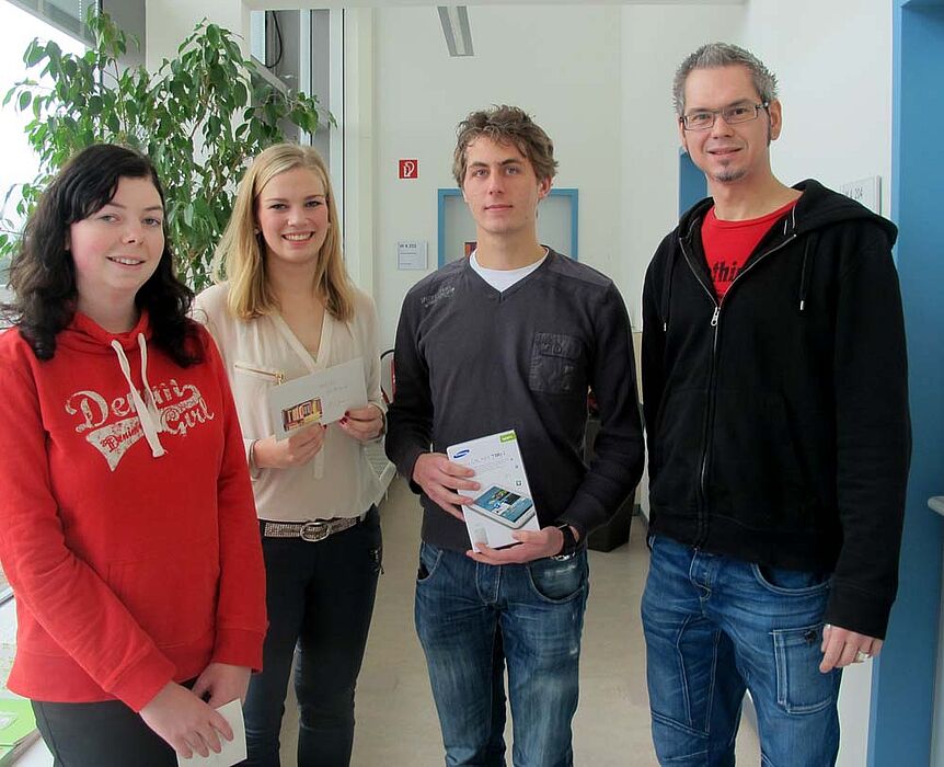 Die Teilnahme an einer Befragung zur Organisation und Durchführung der Orientierungswoche für Erstsemester „Start ins Studium“ (O-Phase) im Wintersemester 2013/14 verhalf dem Studenten Sven Beutel zum Gewinn eines brandneuen Samsung Galaxy Tablets. „Damit hätte ich nicht gerechnet“, so der Erstsemester des Studiengangs Computer Engineering, nachdem Jörn Sickelmann (stellv. Leiter der ZSB) ihm das Tablet überreicht hatte. Neben dem 1. Preis wurden auch zwei weitere Preise verlost: Über einen Büchergutschein und eine AStA-Kopierkarte freuen sich die Studentinnen Janine Hamm (Lehramt GyGe Mathe/Physik) und Alina Jonas (IBS).