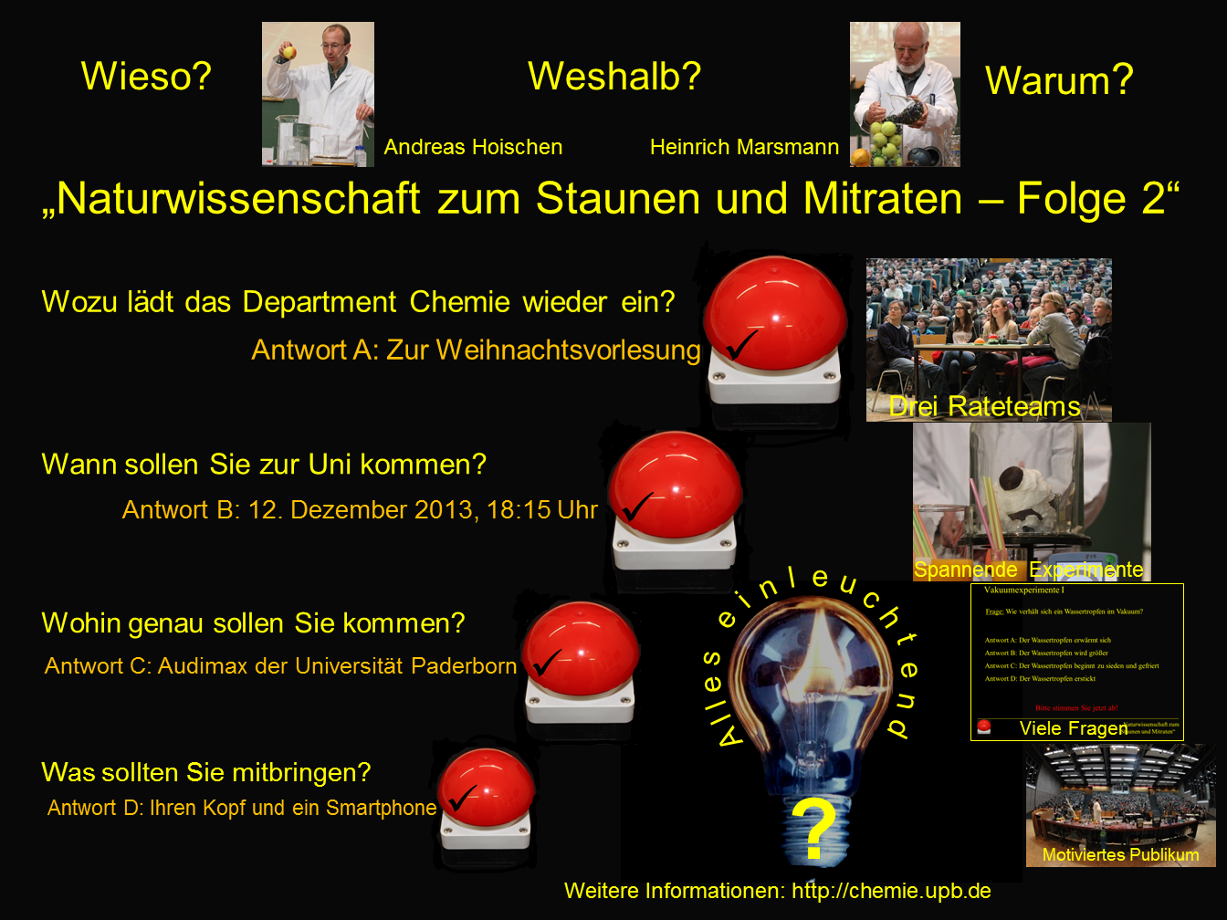 Das Department Chemie der Universität Paderborn lädt für den 12. Dezember zur achten Weihnachtsvorlesung ein, in der Prof. i. R. Dr. Heinrich Marsmann und Dr. Andreas Hoischen eine zweite Auflage der Naturwissenschaft zum Staunen und Mit-Raten präsentieren.