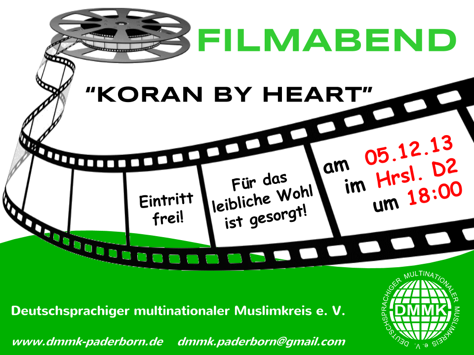 Der studentische deutschsprachige multinationale Muslimkreis (DMMK) lädt zum Film-Abend ein! Gezeigt wird der englischsprachige Dokumentarfilm "Koran by heart" (90 Minuten). Im Anschluss daran besteht die Möglichkeit, den Abend bei einer Tasse Kaffee/Tee mit kleinen Leckereien ausklingen zu lassen!