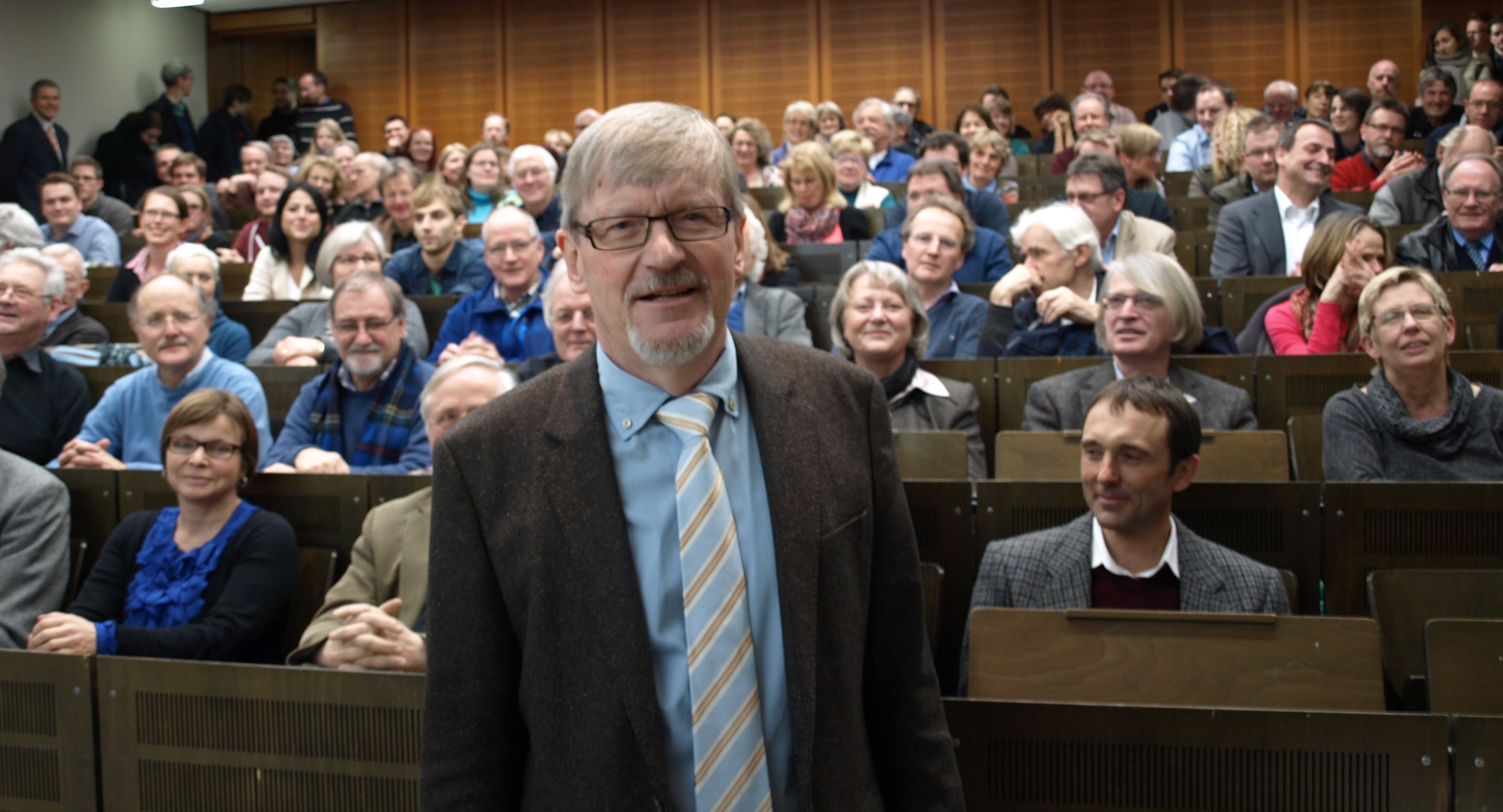 Mit dem Thema „Verbraucherrisiken durch Antibiotikaeinsatz in der Landwirtschaft – Kann Rohkost gefährlich sein?“ beendete Prof. Dr. Manfred Grote seine aktive Zeit als Hochschullehrer an der Universität Paderborn. Am Montag, 27. Januar, lud das Department Chemie zum Vortrag des analytischen Chemikers ein. Seine Familie sowie zahlreiche Interessierte und Weggefährten verabschiedeten Manfred Grote und folgten noch einmal einem seiner Vorträge. Unter ihnen auch Prof. Dr. Torsten Meier, Dekan der Fakultät für Naturwissenschaften, Prof. Dr. Dorothee M. Meister, Vizepräsidentin für Lehre, Studium und Qualitätsmanagement, und Dr. Heinrich Bottermann, Generalsekretär der Deutschen Bundesstiftung Umwelt, der sich als ehemaliger Referatsleiter für Tierschutz und Tierarzneimittel im Ministerium für Umwelt und Naturschutz, Landwirtschaft und Verbraucherschutz Nordrhein- Westfalens für die Forschungen Grotes eingesetzt hatte.