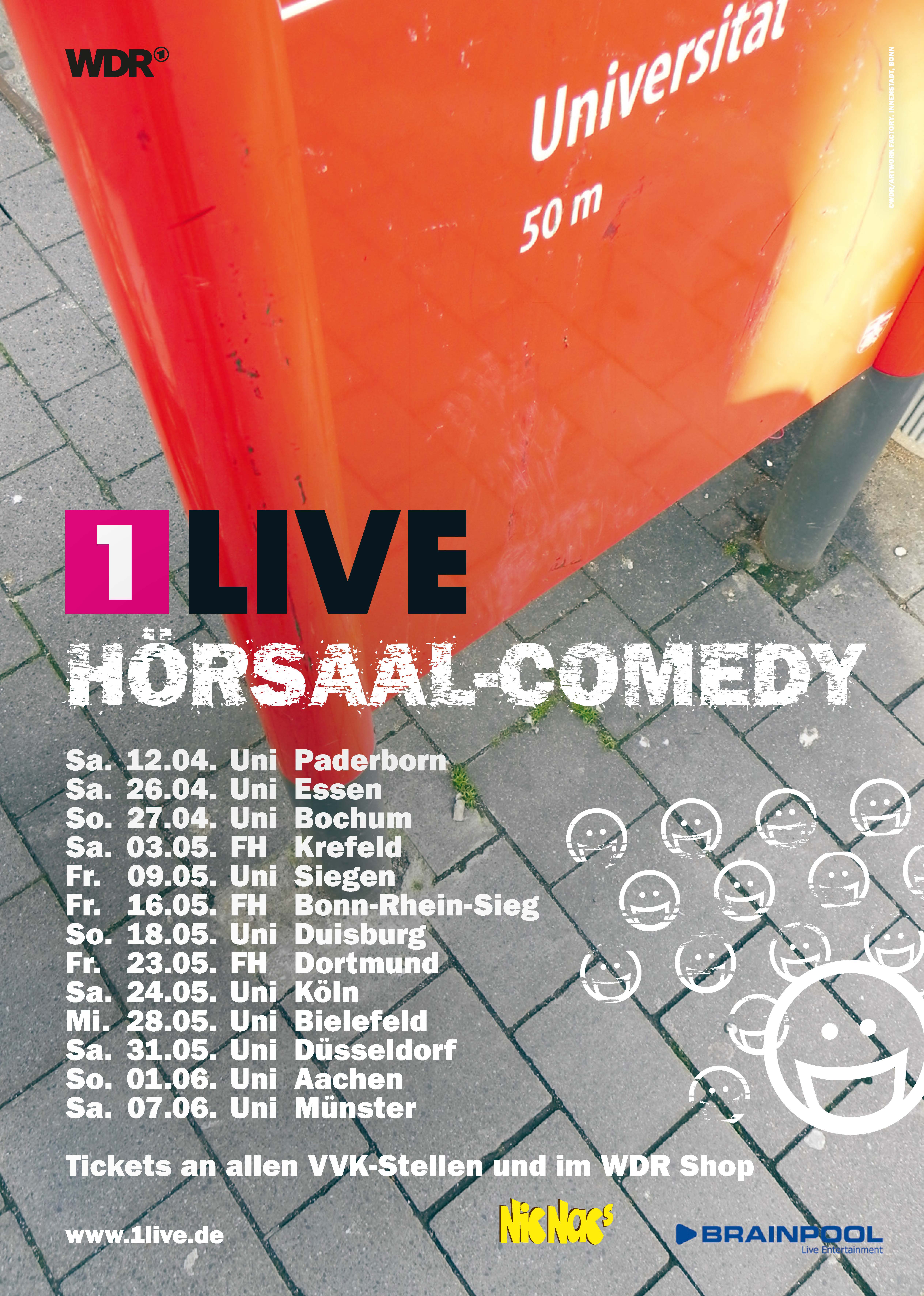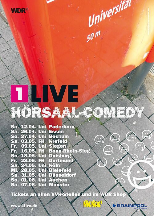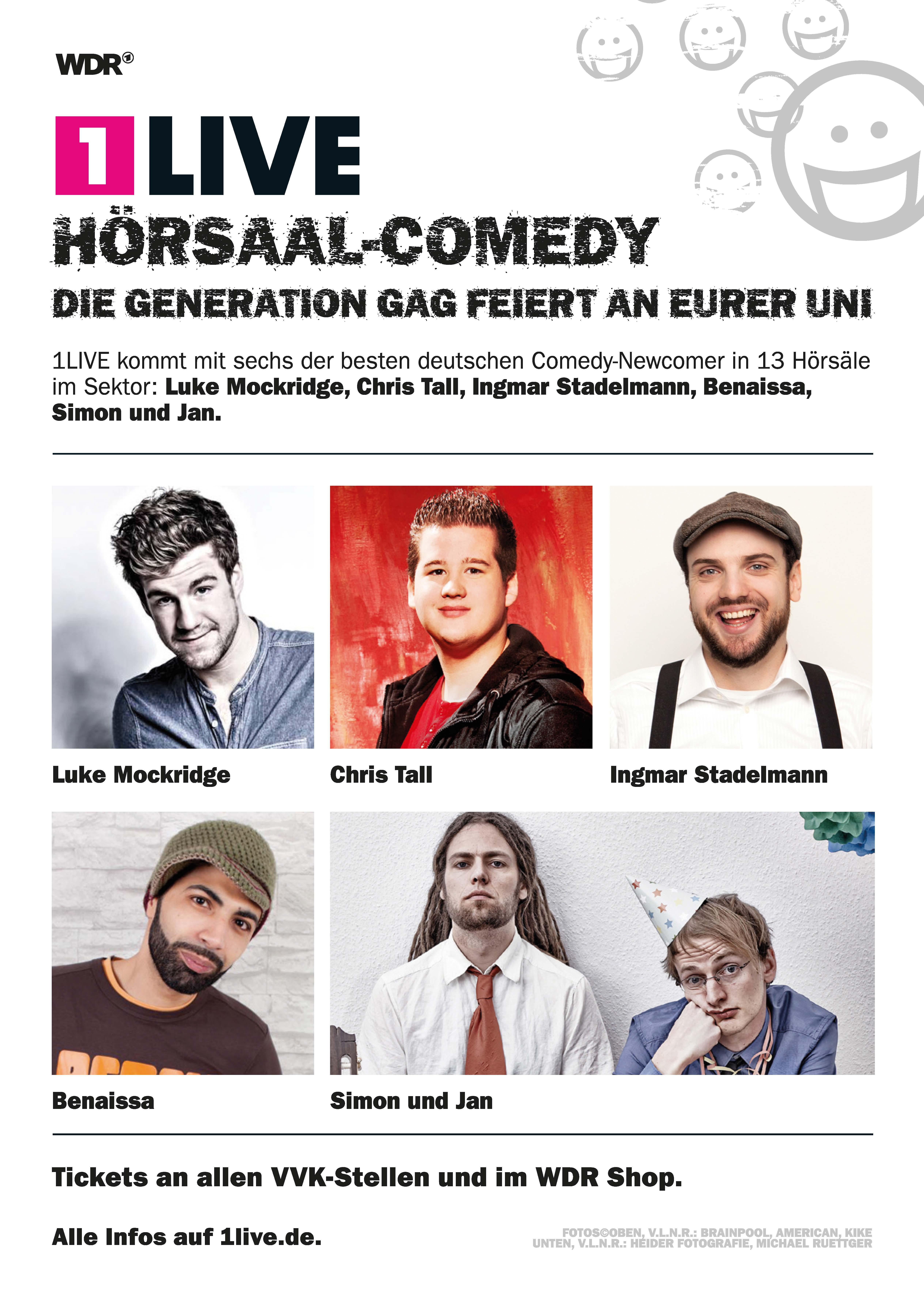 Die 1LIVE Comedians Luke Mockridge und Ingmar Stadelmann freuen sich auf volle Hörsäle: „Die 1LIVE Hörsaal-Comedy ist eine riesige Comedyparty. Hunderte lachen über den, der an der Tafel steht. Das haben wir doch immer schon gewollt!“ Nach dem Erfolg einer komplett ausverkauften Tour im vergangenen Jahr wurde die Anzahl der Unis auf dreizehn erhöht.