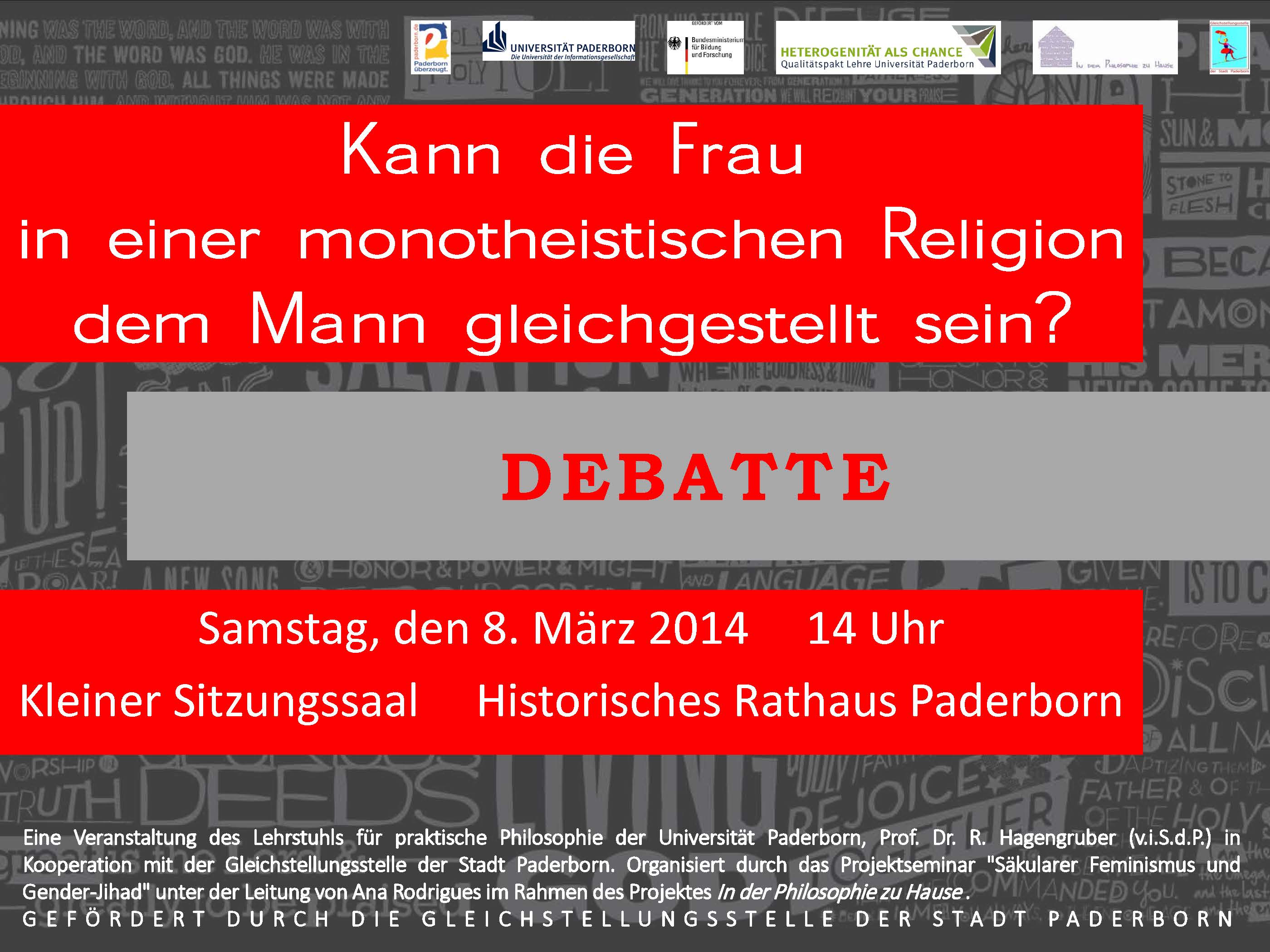 Das Projektseminar „Säkularer Feminismus und Gender-Jihad“ der Universität Paderborn lädt im Rahmen der Veranstaltungen der Gleichstellungsstelle der Stadt Paderborn am internationalen Frauentag zu einer Debatte ein.
