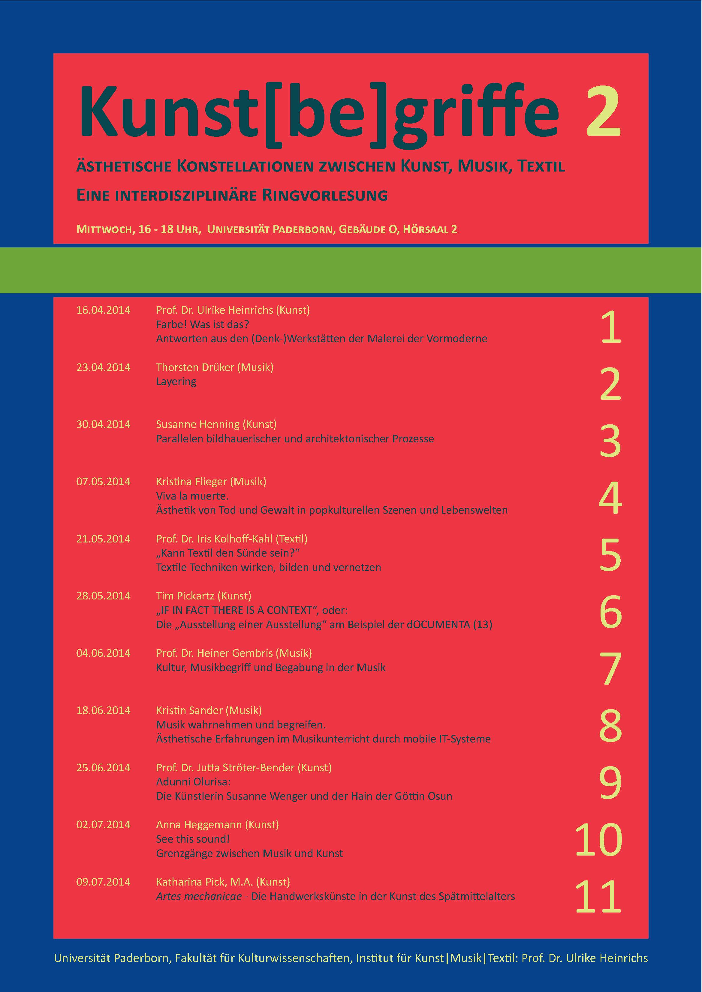 Wie schon im Sommersemester 2013 gehen die Beiträge der Ringvorlesung auch in diesem Jahr von stark unterschiedlichen und eigenwilligen künstlerischen oder geisteswissenschaftlichen Positionen aus, um dabei jeweils die gemeinsamen Grundlagen der drei Fächer zu reflektieren. Erneut werden Resonanzen und Spannungen zwischen künstlerischer Produktion, ästhetischer Erfahrung und historisch-hermeneutischer Begriffsarbeit in den Blick genommen. An den Vorträgen beteiligen sich u. a. auch junge Nachwuchswissenschaftlerinnen und Nachwuchswissenschaftler aus allen drei Fächern. Die Ringvorlesung versteht sich ausdrücklich als ein integratives Forum und wendet sich daher an die Mitglieder des Instituts, der Universität und an die Öffentlichkeit.