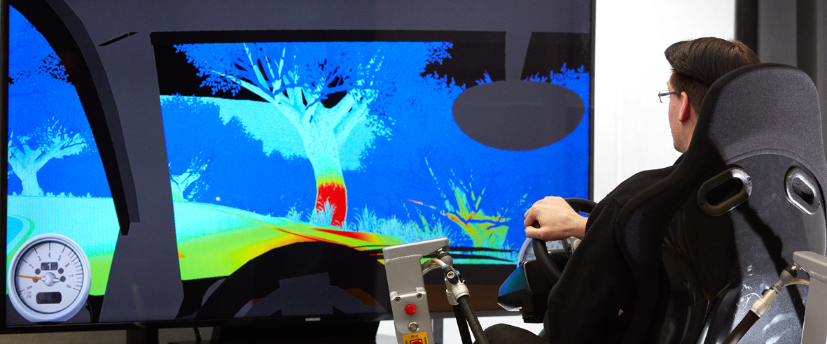Abbildung: Virtuelle Testfahrt mit einem intelligenten Scheinwerfersystems im Nachtfahrtsimulator (© Heinz Nixdorf Institut)