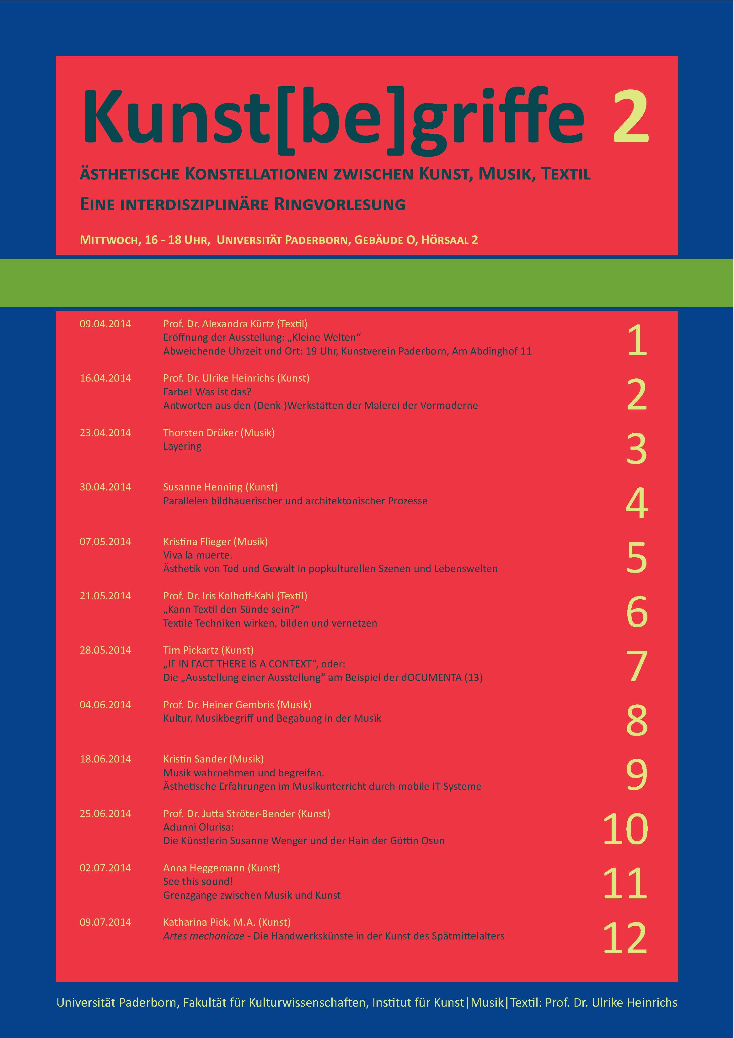 Bereits zum zweiten Mal wird das Lehrangebot am Institut für Kunst, Musik, Textil durch eine interdisziplinäre Ringvorlesung bereichert. Wie schon im Sommersemester 2013 gehen die Beiträge auch in dieser Saison von stark unterschiedlichen und eigenwilligen künstlerischen oder geisteswissenschaftlichen Positionen aus, um dabei jeweils auf die gemeinsamen Grundlagen der drei Fächer zu reflektieren.