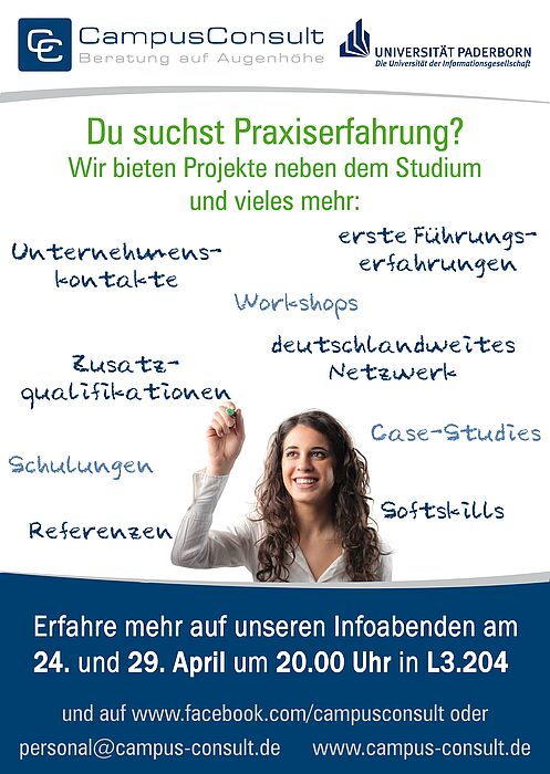 Die studentische Initiative Campus Consult e. V. veranstaltet am 24. und 29. April jeweils um 20.00 Uhr im Raum L3.204 an der Universität Paderborn ihre Infoabende. Dazu sind alle Studierenden willkommen. Nach den informierenden Programmpunkten können in einer gemütlichen Atmosphäre bei Getränken und kleinen Snacks erste Kontakte geknüpft werden.