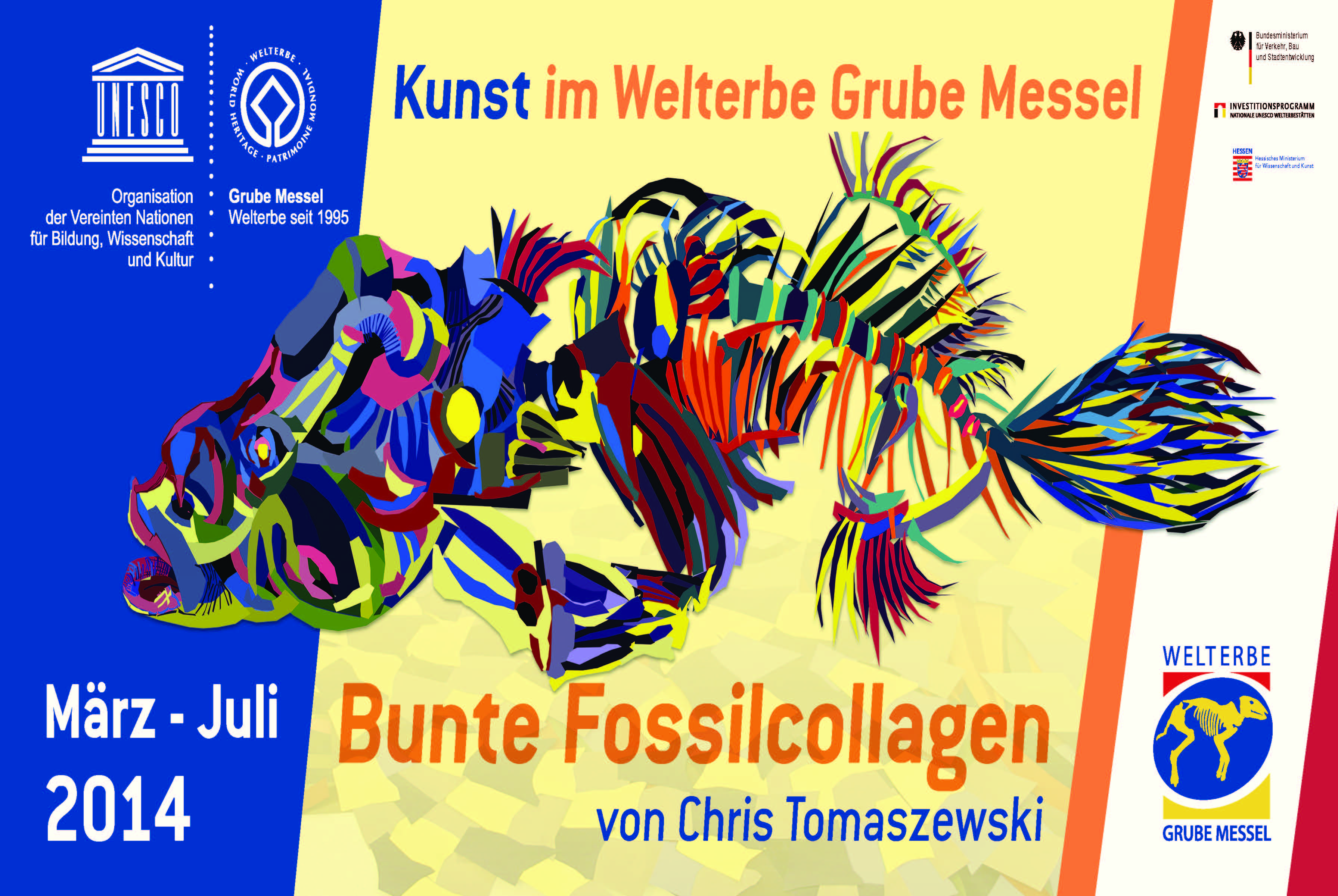 Bunt und zerbrechlich tummeln sich großformatige Papiercollagen des Künstlers und Promovenden Chris Tomaszewski an den Decken und Wänden des Besucherzentrums Grube Messel. Es sind künstlerische Fossilien, deren Farbigkeit ab April 2014 für drei Monate täglich über den Köpfen der Besucher leuchtet. "Bunte Fossilcollagen", ein Ausstellungstitel und Arbeitsthema das den Blick der Kunst mit Wissenschaft verknüpft.