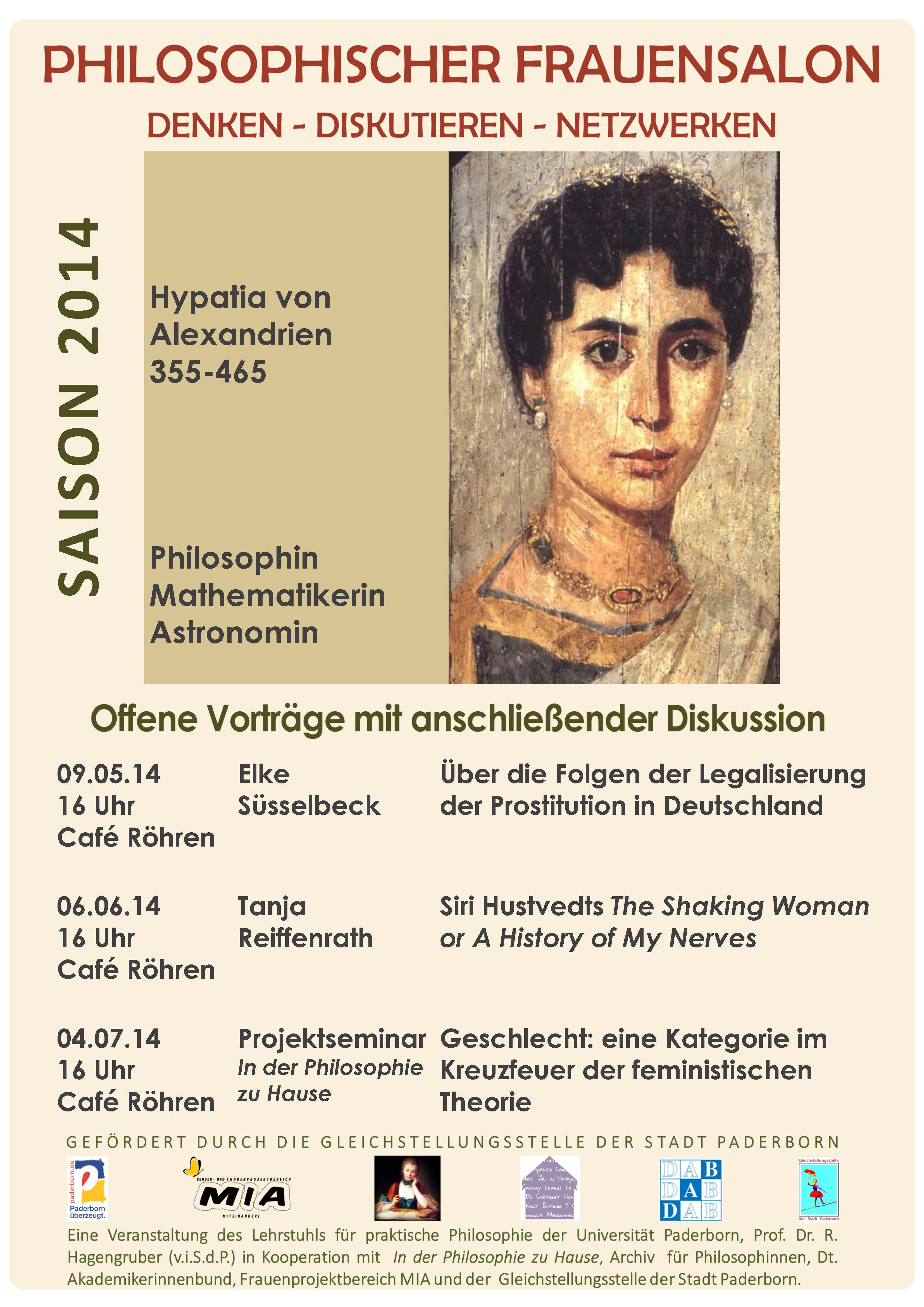 Am 9. Mai, 16 Uhr, eröffnet Elke Süsselbeck, Rechtsanwältin in Paderborn, die Sommersaison 2014 des philosophischen Frauensalons mit einem Vortrag zum Thema „Über die Folgen der Legalisierung der Prostitution in Deutschland“. Der Impulsvortrag mit anschließender Diskussion findet wie alle Vorträge des philosophischen Frauensalons im Café Röhren an der Mühlenstraße in Paderborn statt. Alle Interessierten sind zu dieser offenen Veranstaltung herzlich eingeladen.