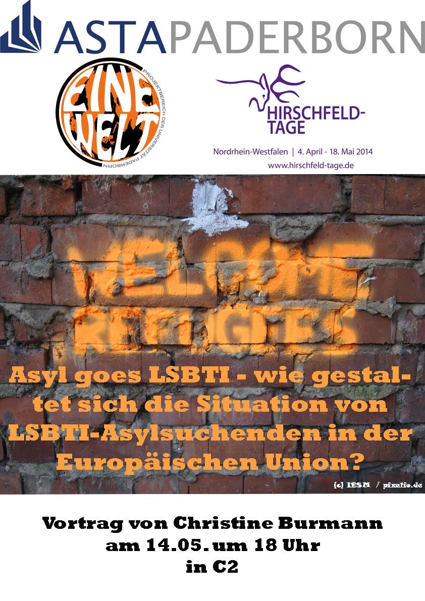 In Russland wurde ein sogenanntes Homo-Propaganda-Gesetz verabschiedet und in Den Haag beschließt der europäische Gerichtshof, dass LSBTI*-Asylsuchende in der EU ein Recht auf Asyl haben. Man merkt also, bei dem Themenkomplex Asyl und LSBTI* ist momentan viel los und es bleibt spannend. Daher wird es Zeit, sich damit ausgiebiger und umfassender zu beschäftigen. Hierfür konnte Christine Burmann gewonnen werden (Diplom-Politologin und Menschenrechtsexpertin), die mit ihrem Vortrag und der anschließenden Diskussion Licht in diesen Themenkomplex bringen wird.