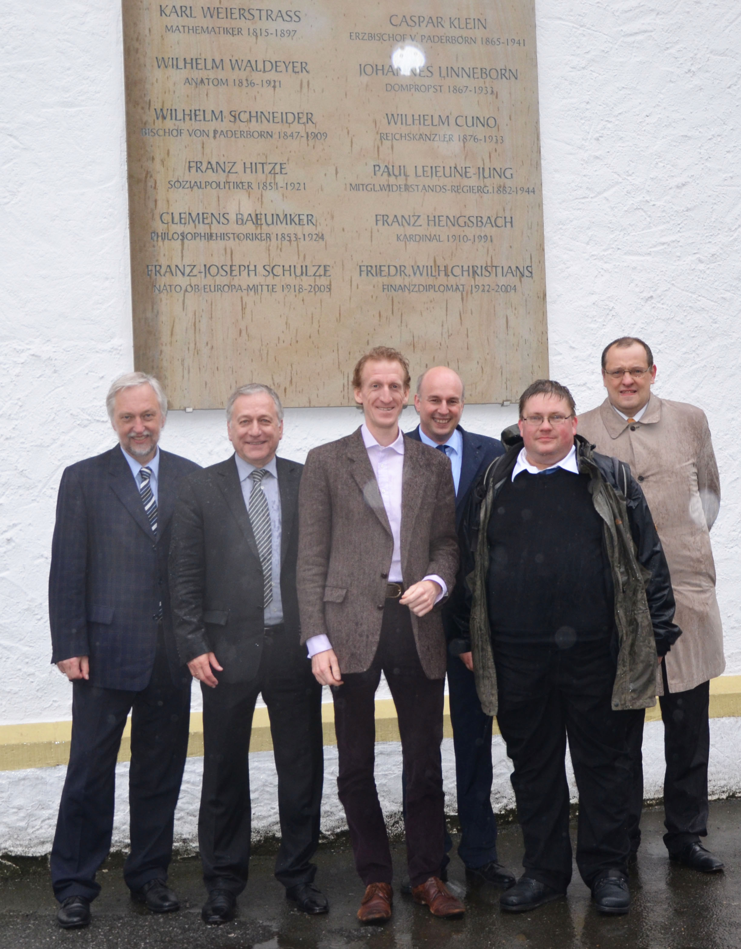 Abbildung: Trotz Regen gutgelaunt vor der Gedenktafel am Gebäude des Gymnasiums Theodorianum, v. l. n. r.:Prof. Dr. Wilhelm Schäfer (Vizepräsident für Forschung und wissenschaftlichen Nachwuchs der Universität Paderborn), Dr. Michael Laska (Geschäftsführer), Prof. Ben Green, Prof. Dr. Jürgen Klüners (Dekan), Prof. Dr. Torsten Wedhorn (Leiter des Instituts für Mathematik), Dr. Ulf Hashagen.