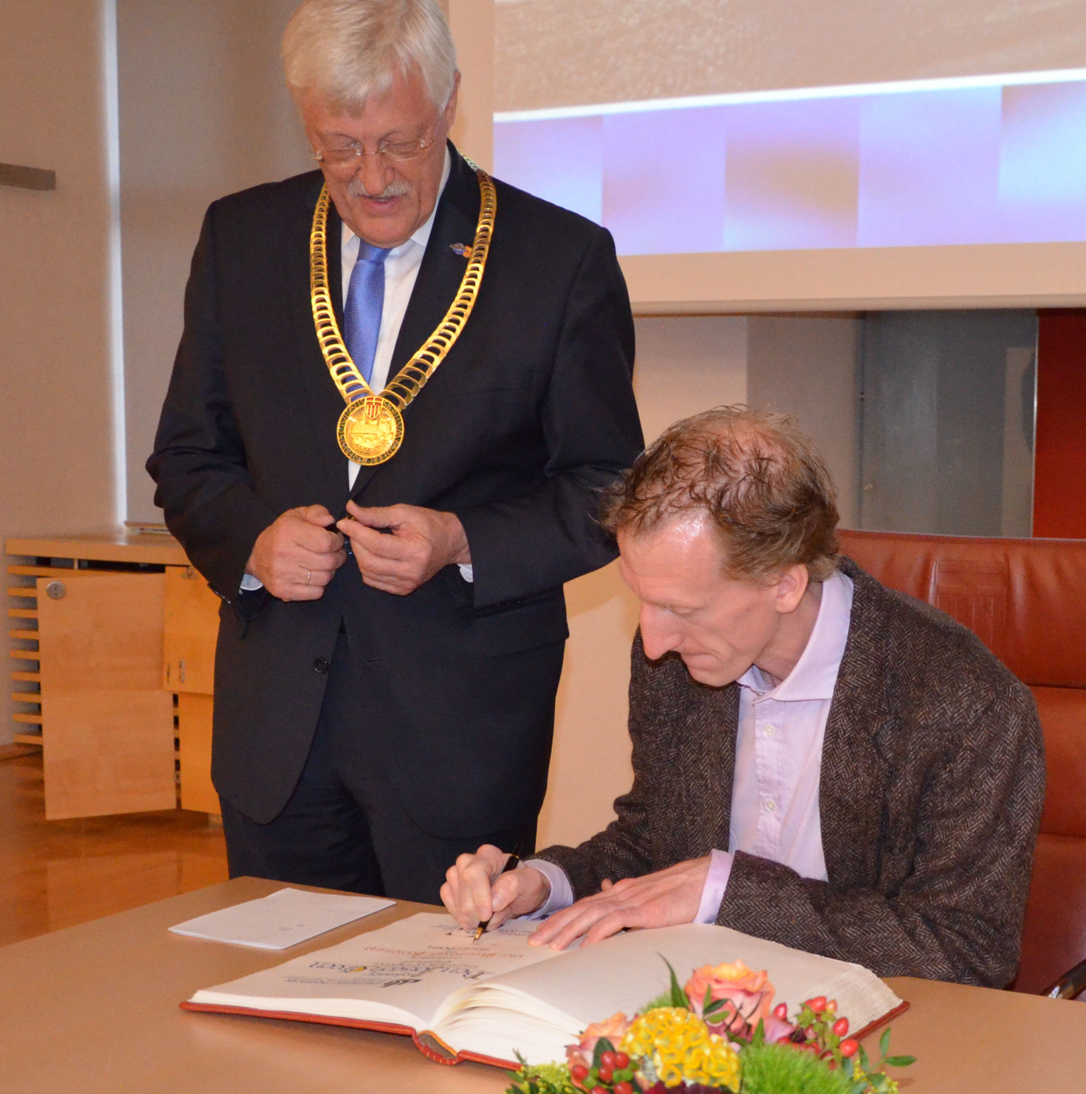 Abbildung: Prof. Ben Green trägt sich in das Goldene Buch der Stadt ein.