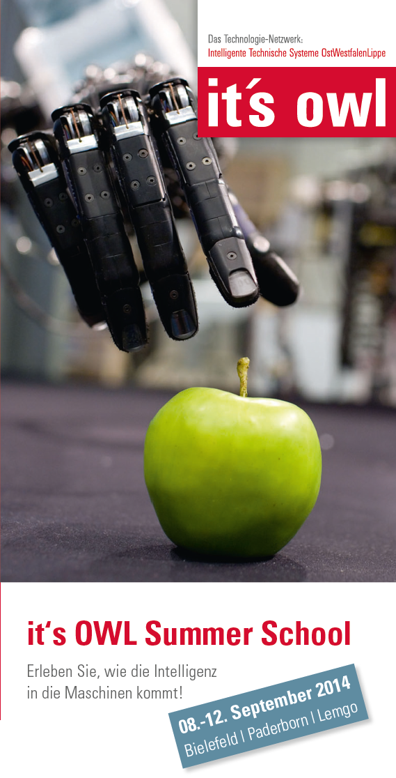 Der Spitzencluster it's OWL (Intelligente Technische Systeme OstWestfalenLippe) liefert konkrete Lösungen für Industrie 4.0. Zusammen mit den regionalen Hochschulen, Forschungseinrichtungen und Unternehmen veranstaltet das Technologie-Netzwerk vom 8. bis12. September zum zweiten Mal die it's OWL Summer School. Die Veranstaltung richtet sich an Masterstudierende, Promovierende und Young Professionals der Ingenieur- und Naturwissenschaften sowie Informatik oder Mathematik. Die Teilnehmer haben die Chance, sich in Vorträgen, Workshops und Demonstrationen über aktuelle Forschungsergebnisse und Anwendungsmöglichkeiten zu informieren und mit Weltmarktführern und Spitzenforschungseinrichtungen über Trends und Entwicklungen zu diskutieren. Im Rahmenprogramm erhalten sie darüber hinaus Einblicke in die Vorzüge der Region OstWestfalenLippe. Die Teilnehmerzahl ist auf 30 Plätze begrenzt. Die Bewerbungsfrist endet am 31. Mai 2014.
