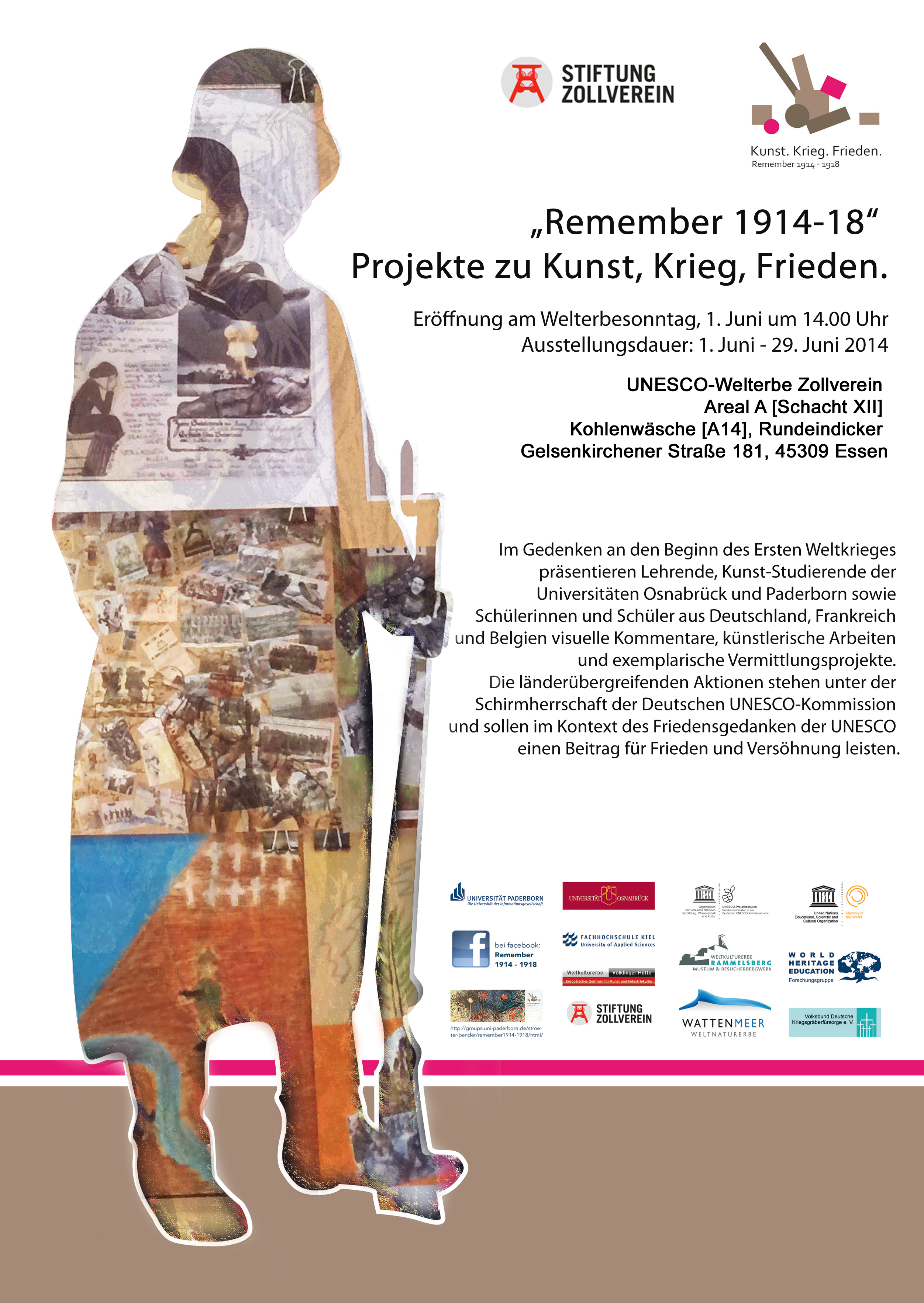 Vom 1. Juni bis 29. Juni 2014 ist die UNESCO-Welterbestätte Zollverein Schauplatz für eine dreiteilige Ausstellung verschiedener Kunstvermittlungsprojekte zum Thema „Kunst, Krieg, Frieden – Remember 1914-18“ der Universitäten Paderborn und Osnabrück. Die Eröffnung ist am UNESCO-Welterbetag, Sonntag, 1. Juni, 14 Uhr. Im Gedenken an den Ersten Weltkrieg präsentieren Studierende der Universitäten Osnabrück und Paderborn sowie Schülerinnen und Schüler aus Deutschland, Frankreich und Belgien kreative Arbeiten.