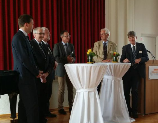 Foto (Uwe Hörnlein): Eröffneten die Aktionstage „TeachFuture“: (v.l.n.r.) Michael Urhahne, Kreisberufskolleg Brakel, Wolfgang Reif, Richard-von-Weizsäcker-Berufskolleg Paderborn, Bernhard Gödde, Gymnasium Schloß Neuhaus, Michael Uhlich, Bezirksregierung Detmold, Dr. Harry Liedtke, NRW-Ministerium für Schule und Weiterbildung, und Prof. Nikolaus Risch, Präsident der Universität Paderborn.