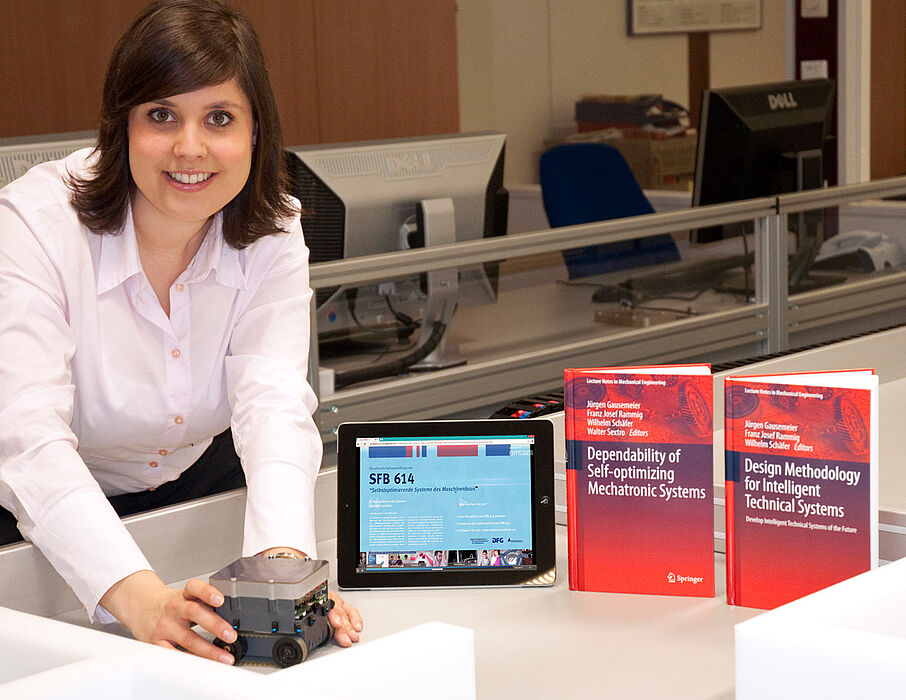 Der Grundgedanke des Sonderforschungsbereichs (SFB) ist, dass Systeme ihr Handeln selbstständig an veränderte Umgebungsbedingungen anpassen. Züge könnten so nach Bedarf und nicht nach Fahrplan fahren und von selbst auf Witterungsänderungen reagieren. Solche Maschinen zu entwickeln, ist jedoch enorm aufwändig und erfordert neben spezifischem Fachwissen auch ein konkret durchdachtes Vorgehen. „Genau deshalb möchten wir Entwicklern und Entwicklerinnen einen Leitfaden an die Hand geben, welche Methoden und Verfahren bei der Realisierung hilfreich sein können“, sagt Dipl.-Wirt.-Ing. Mareen Vaßholz, Geschäftsführerin des SFB und Wissenschaftlerin am Heinz Nixdorf Institut. Die Bücher „Design Methodology for Intelligent Technical Systems“ und „Dependability of Self-Optimizing Mechatronic Systems“ (Springer Verlag) bündeln die Erkenntnisse des Forscher-Teams und geben Tipps aus der Praxis.