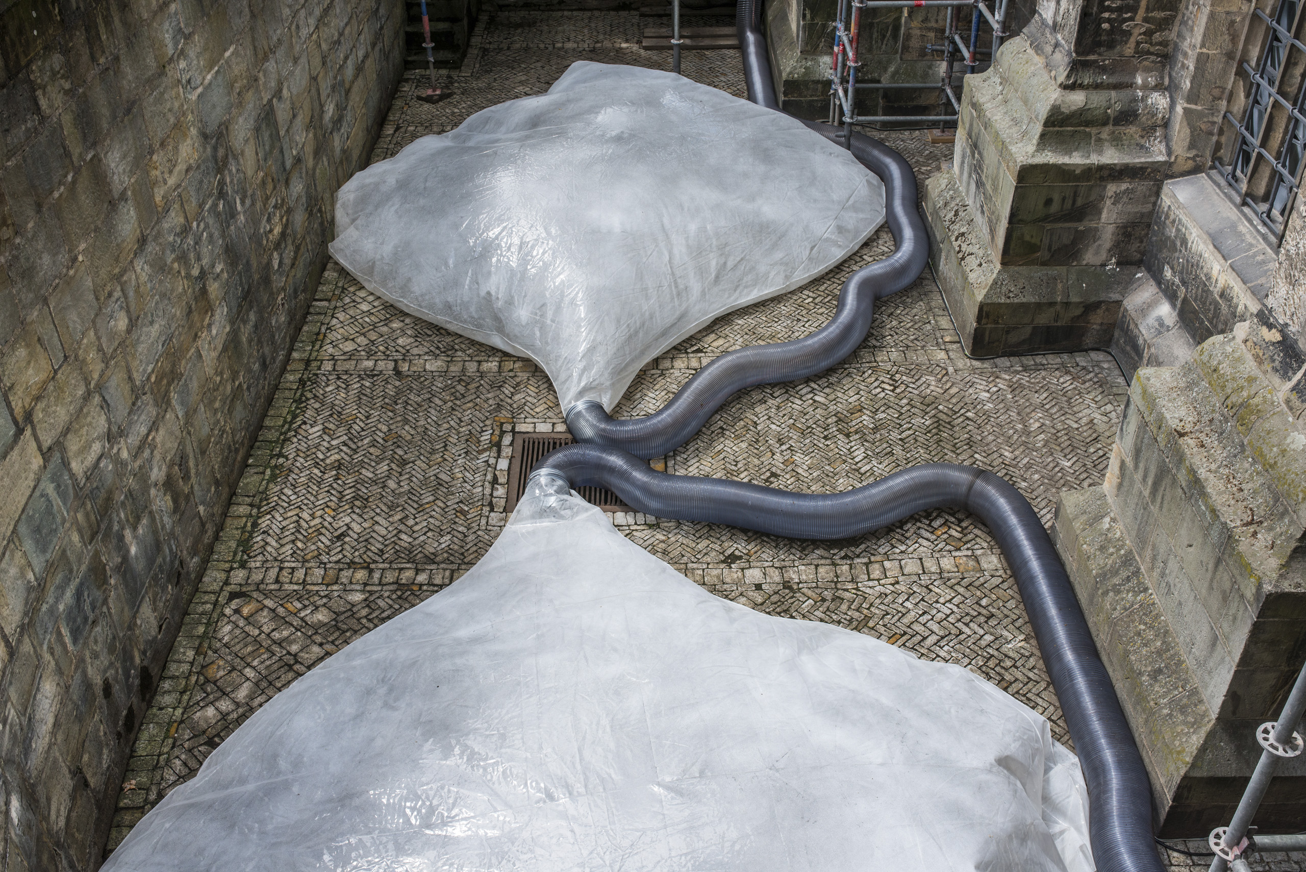 In der Senke zwischen Dom und Domplatz hebt und senkt sich eine riesige Kunststoff-Lunge. Man hört das verfremdete Atemgeräusch eines Pferdes. Lebenszeichen zwischen Toten: Im Dom, direkt neben der atmenden Skulptur, ist die letzte Ruhestätte der Bischöfe, der Domplatz war bis 1808 ein Friedhof.