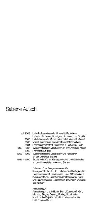 Sabiene Autsch begreift ihre künstlerische Arbeit als eine, die nicht nur im Atelier beginnt und endet. Bildproduktion und Bildpräsentation gehören stets zusammen und werden auch als zusammenhängend reflektiert. Die gewählten Schauanordnungen sind Teil eines umfassenden künstlerischen Prozesses. Die für die aktuelle Ausstellung in der Burg Dringenberg gewählte Präsentationsform, ein Raum-im-Raum-Modell, erinnert an die Arbeitsformen eines Ateliers, ebenso aber auch an die Architektur eines Archivs.