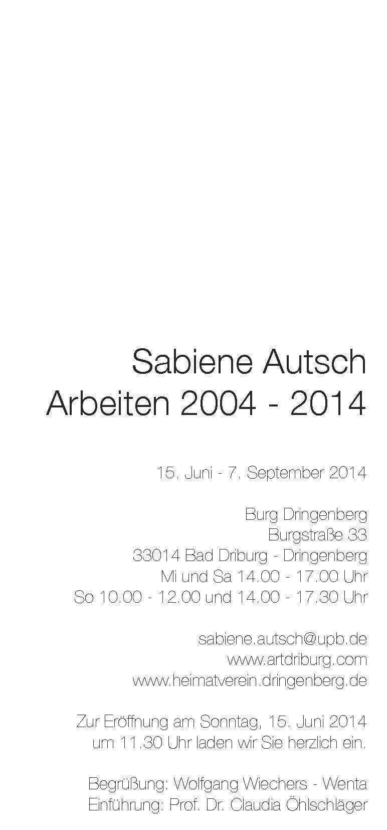 Kontakt: Prof. Dr. Sabiene Autsch, Kulturwissenschaftliche Fakultät Paderborn, Institut für Kunst, Musik, Textil, Universität Paderborn, Warburger Str. 100, 33098 Paderborn, sabiene.autsch@upb.de und http://www.artdriburg.com