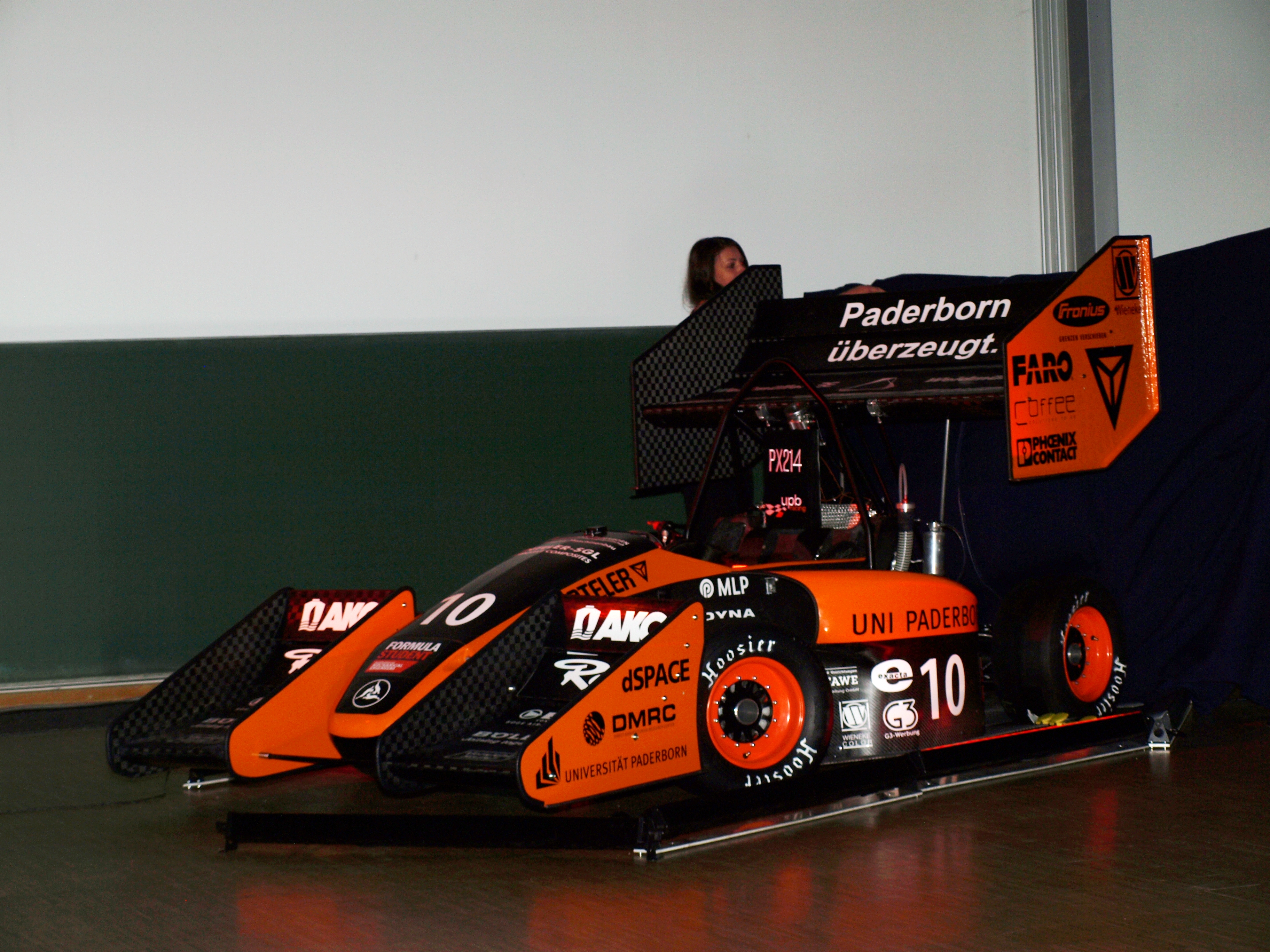 Der aktuelle Wagen PX214 wurde von insgesamt 40 Team-Mitgliedern umgesetzt. Interdisziplinär wurde in den Bereichen Forschung und Entwicklung, Finanzierung, Umsetzung und Öffentlichkeitsarbeit gearbeitet. Im zum Programm gehörenden Interview mit den technischen Leitern der Bereiche Motor/Antrieb, Fahrwerk, Elektrotechnik und Chassis wurde deutlich, welche Neuerungen am PX214 im Vergleich zum Vorjahresmodel PX213 umgesetzt wurden. Äußerlich fallen besonders die im Vergleich zum Vorjahr kleineren Reifen, die für besseren Grip sorgen sollen, und die großzügig angebrachten aerodynamischen Anbauteile auf. Aber auch „innerlich“ hat der Wagen Neuerung zu bieten. Durch die Überwachung wichtiger Fahrzeugparameter können Werte wie Bremszeit und Wassertemperatur in Echtzeit erfasst werden. Ein eingebautes GPS-Signal ermöglicht es dem Team, zu sehen, auf welchem Streckenabschnitt mögliche Schwierigkeiten auftauchen, sodass diese zeitig behoben werden können. Videos lockerten die Beiträge der Redner des Teams auf und verdeutlichten ihre Ausführungen noch einmal bildlich.