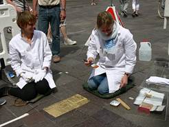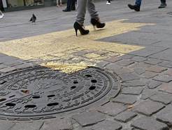 Ein Baustellenensemble lässt zunächst an Straßenarbeiten denken. Erst bei näherem Hingehen kann die Kunstinstallation erkannt werden. Clea Stracke und Verena Seibt belegen in akribischer Feinarbeit und nach alten Handwerksregeln den Boden mit Gold, dem Symbol für Glanz und Ewigkeit, Macht und Reichtum. Stück für Stück werden Betonplatten, Gulli-Deckel, Pflastersteine mit Blattgold überzogen. Ein Gegensatz zum alltäglichen Umgang mit der Straße, die man sonst nur mit Füßen (be-)tritt. Durch die liebevolle Behandlung des absolut Profanen wird der Fokus auf das Phänomen der Fußgängerzone selbst gelenkt. Die Langsamkeit der Vergoldungsprozedur steht dem Passantenstrom entgegen und lädt zum Innehalten ein. Was mit der goldenen Fläche geschieht, wenn die Fläche freigegeben ist, bleibt abzuwarten. Vielleicht werden die Spuren der Zeit, des Wetters, der Schritte die wertvolle Schicht nach und nach abtragen. Vielleicht verteilt sich das Gold an den Schuhsolen wie eine Botschaft über die gesamte Stadt.