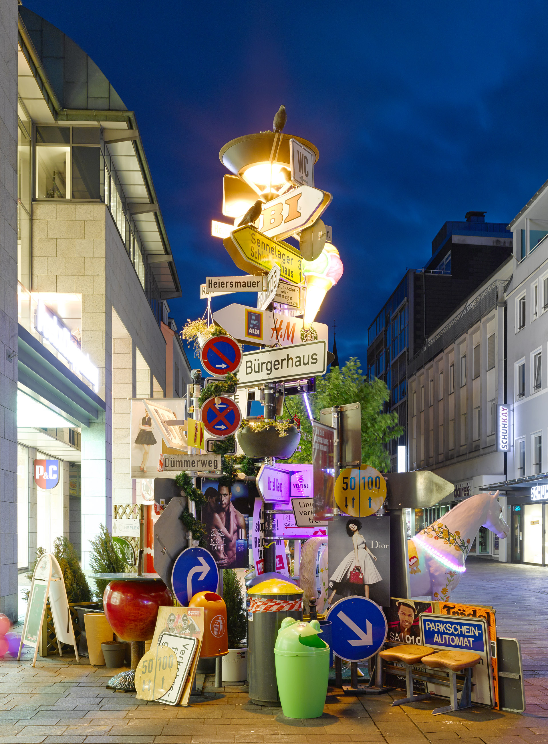 Werbetafeln, Hinweisschilder, Wegweiser, Verkehrszeichen, Bänke, Pflanzkübel, Müllbehälter, Straßenbeleuchtung – die Architektur von Einkaufszonen verschwindet hinter einschlägiger, uniformer Stadtmöblierung. Markus Ambach nimmt das Thema auf. Er hat solche Alltagsgegenstände gesammelt, in einer unübersehbaren Skulptur zusammengeführt und mitten in der Hauptachse der Paderborner Fußgängerzone platziert. Es sind bekannte Formen, alltägliche Objekte. Sie alle benötigen Platz im öffentlichen Raum, doch der gehört eigentlich der Stadtgesellschaft. Oder? Wer nutzt welche Räume im Zentrum der Städte? Und wofür? Und was wäre, wenn all diese Gegenstände aus der Fußgängerzone verschwinden würden?