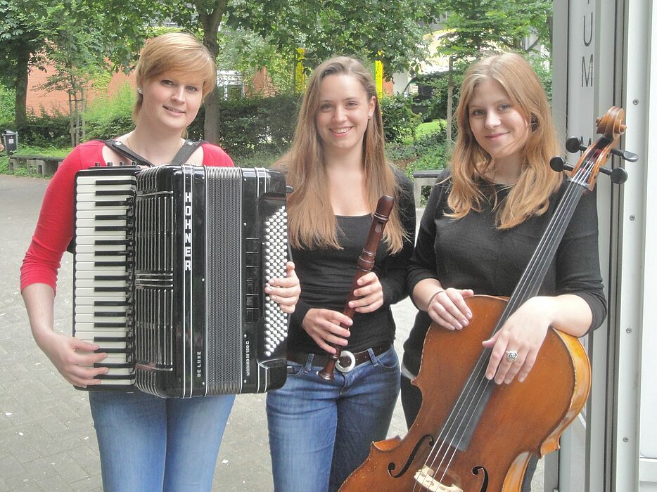 Zu hören sind solistische Highlights vorzugsweise des Gesangs- und Klavierrepertoires, aber auch Ensembles wie die drei Damen Maria Algermissen, Akkordeon, Juliane Jakob, Blockflöte, und Merle Schnug, Violoncello (v. l. auf dem Foto). Eine weitere Attraktion ist die Bearbeitung des Clean-Bandit-Titels "Rather Be" sein, die von Tim Albrecht und Jesley Nicksteit auf drei (!) Instrumenten dargeboten wird.