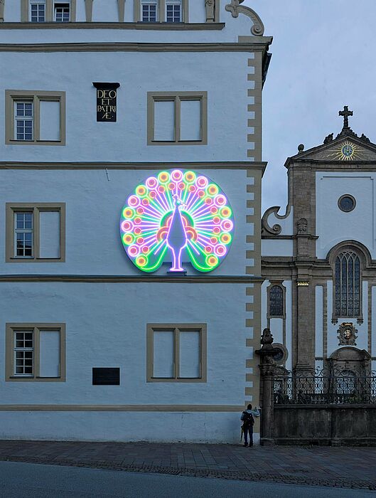 Ein Kunstwerk aus Leuchtstoffröhren, verbunden mit einem Münzautomaten. Die große Neon-Arbeit hat die Form eines stilisierten Pfaus. Der imposante Vogel gilt als Sinnbild für Schönheit, Reichtum und Unbestechlichkeit, aber er steht auch für Dekadenz, Arroganz und Eitelkeit. Für Paderborn hat er als wichtiges Symbol der Stadtgeschichte eine besondere Bedeutung. Wer hier Geldstücke einwirft, kann die Skulptur schrittweise für eine kurze Zeit zum Leuchten bringen. Das Geld kommt als Spende einer gemeinnützigen Organisation in Paderborn zugute. Sometimes nimmt das Motiv der Reizüberflutung durch Werbebotschaften auf und entzieht sich zugleich der Vereinnahmung als Stadtdekoration, weil es erst durch aktive Beteiligung funktioniert. So werden aus "konsumierenden" Betrachter/innen bewusst teilnehmende Akteur/innen.