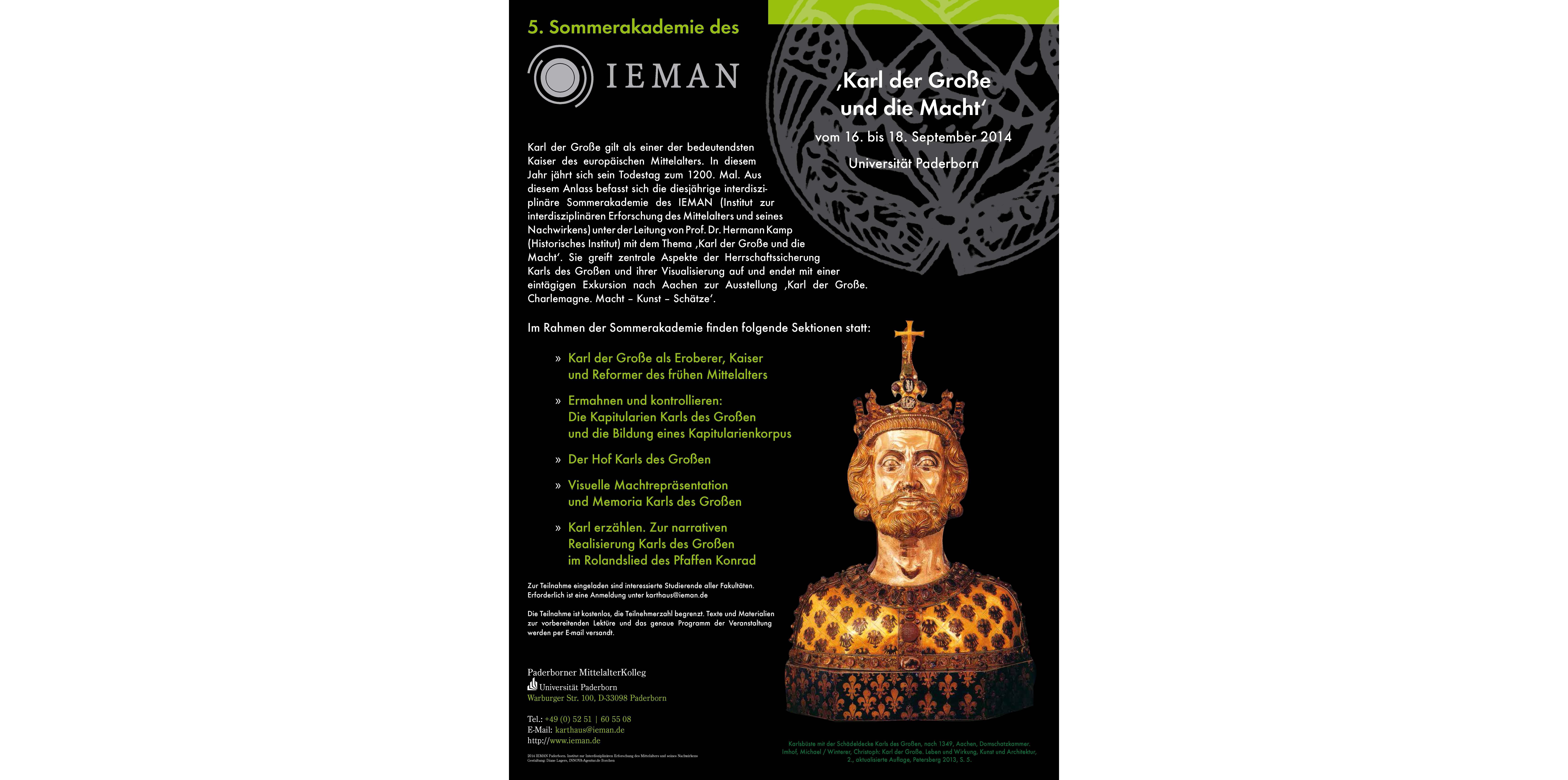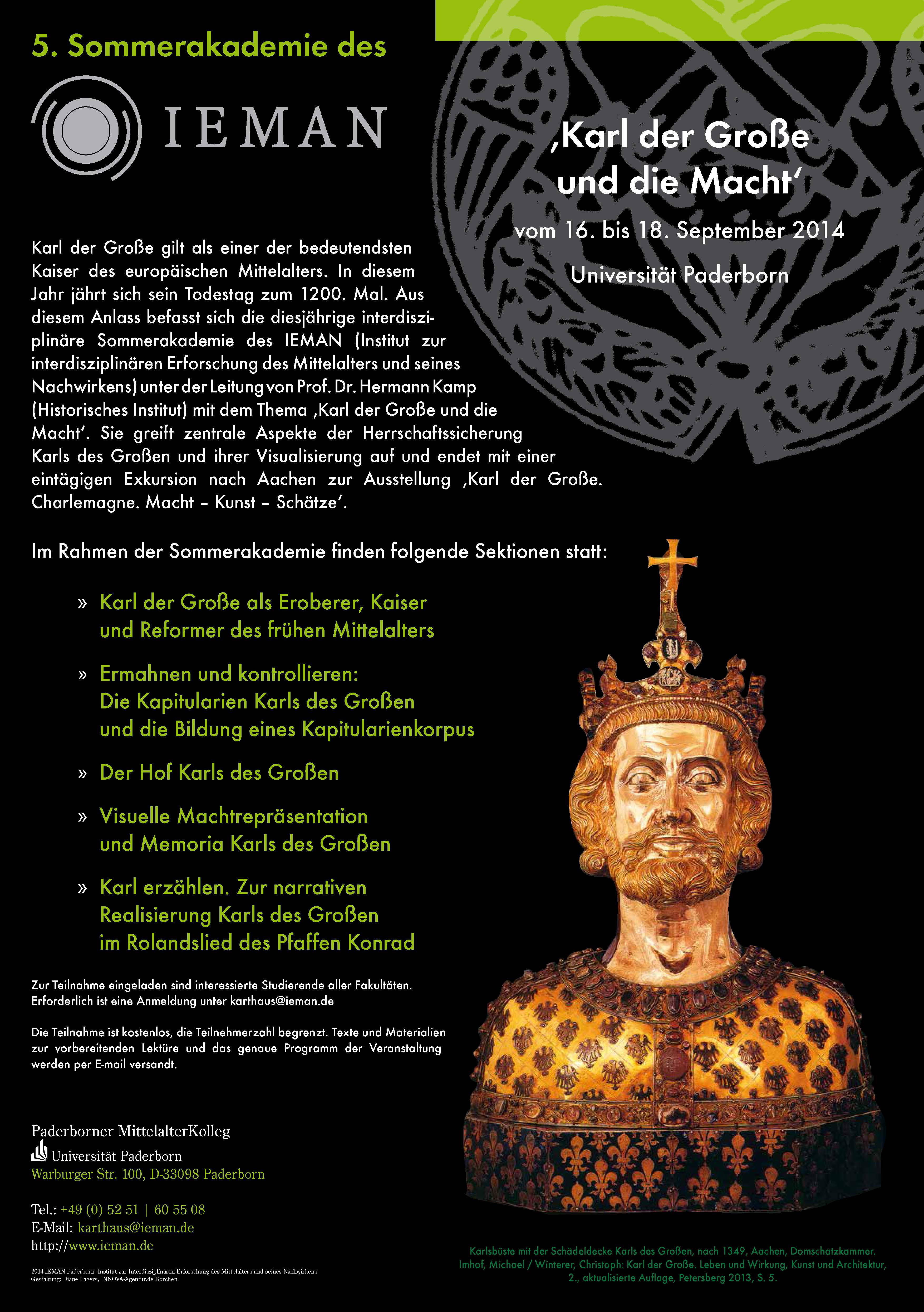 Karl der Große gilt als einer der bedeutendsten Kaiser des europäischen Mittelalters und war auch für die Paderborner Region von entscheidender Bedeutung, ist doch die Gründung der Stadt auf ihn zurückzuführen. In diesem Jahr jährt sich sein Todestag zum 1.200. Mal. Aus diesem Anlass befasst sich die diesjährige interdisziplinäre Sommerakademie des IEMAN (Institut zur interdisziplinären Erforschung des Mittelalters und seines Nachwirkens) mit dem Thema 'Karl der Große und die Macht'. Ziele der interdisziplinären Veranstaltung sind zum einen der wissenschaftliche Austausch mit renommierten Fachwissenschaftlern und zum anderen die wissenschaftliche Nachwuchsförderung. Eingeladen sind Studierende aller Fakultäten der Paderborner Universität, aber auch die anderer Hochschulen sowie weitere Interessierte.