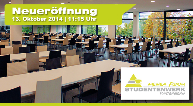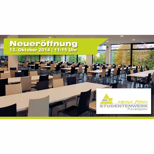 Das Studentenwerk Paderborn führt zurzeit die restlichen Einrichtungsarbeiten der neuen Mensa Forum auf dem Campus Paderborn durch. Diese wird knapp 600 Sitzplätze auf einem sich über 2 Ebenen verteilenden Gastraum von 900 qm bieten. Ein- und Ausgänge befinden sich im Mensa-Foyer (ehemaliger Treff) und im AStA-Foyer. An diesen sind Guthabentester für die DeliCard installiert. Um einen schnellen Zahlungsablauf bei nur 3 Kassen zu gewährleisten, wird in der Mensa Forum ausschließlich bargeldlos gezahlt werden.