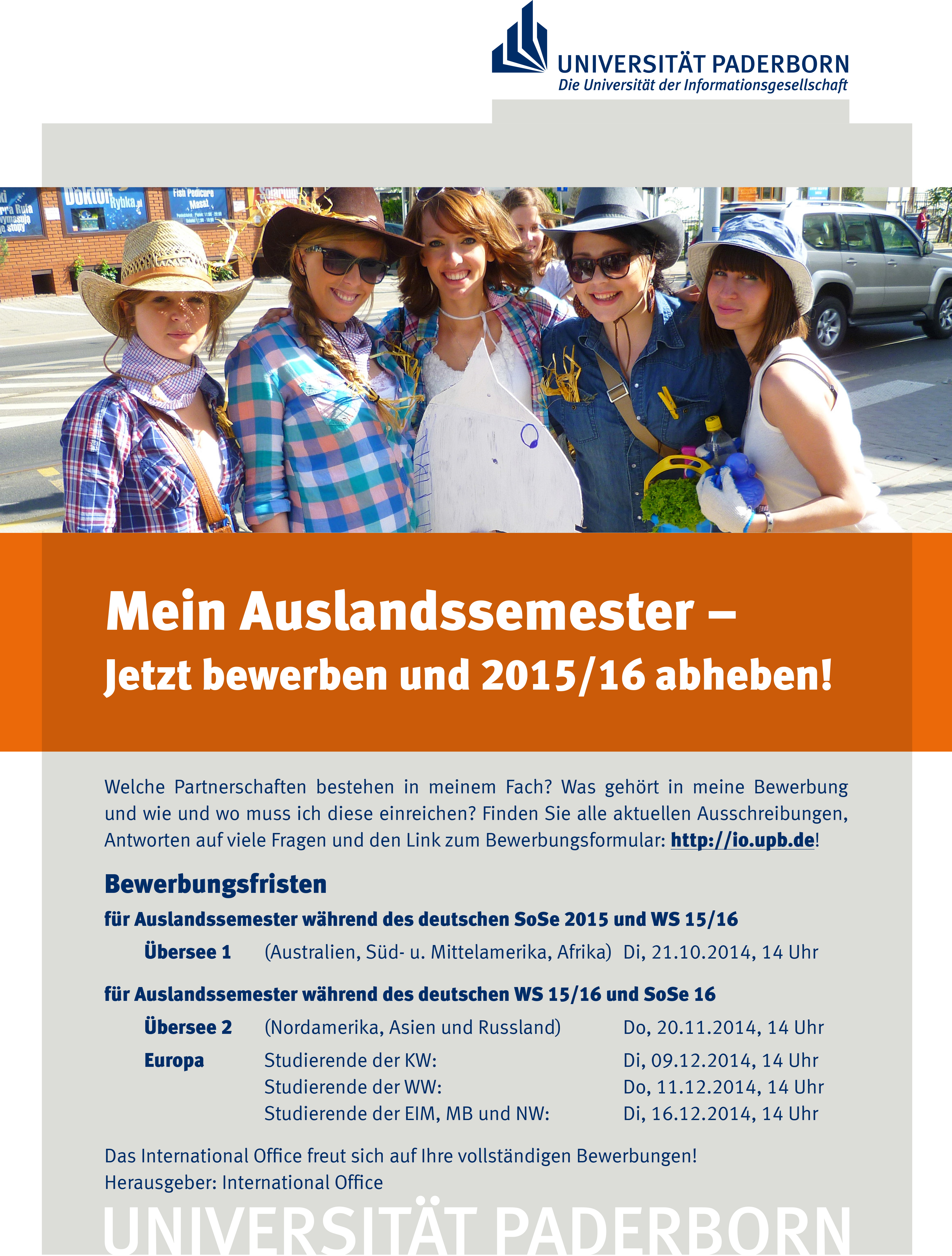 Weitere Informationen zu Partnerhochschulen, dem Bewerbungsprozess etc.: http://www.uni-paderborn.de/studium/international-office/austauschstudierende-outgoing/