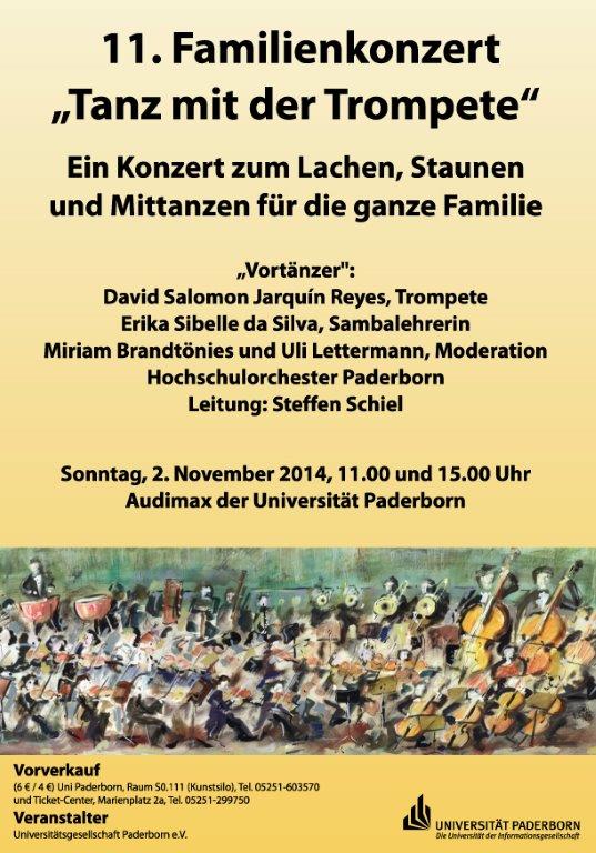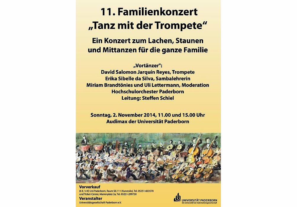 Am Sonntag, 2. November, spielt das Hochschulorchester Paderborn sein jährliches Konzert für Familien. Miriam Brandtönies und Uli Lettermann moderieren das Konzert und Erika da Silva bringt allen im Saal den richtigen Hüftschwung für eine ordentliche Sambastimmung näher. Als Trompeten-Solist tritt David Salomon Jarquín auf, der bereits beim Sommerkonzert die Zuschauer in Erstaunen und Begeisterung versetzte. Die beiden Aufführungen im Audimax der Universität beginnen um 11 und 15 Uhr, die Leitung hat Dirigent Steffen Schiel.