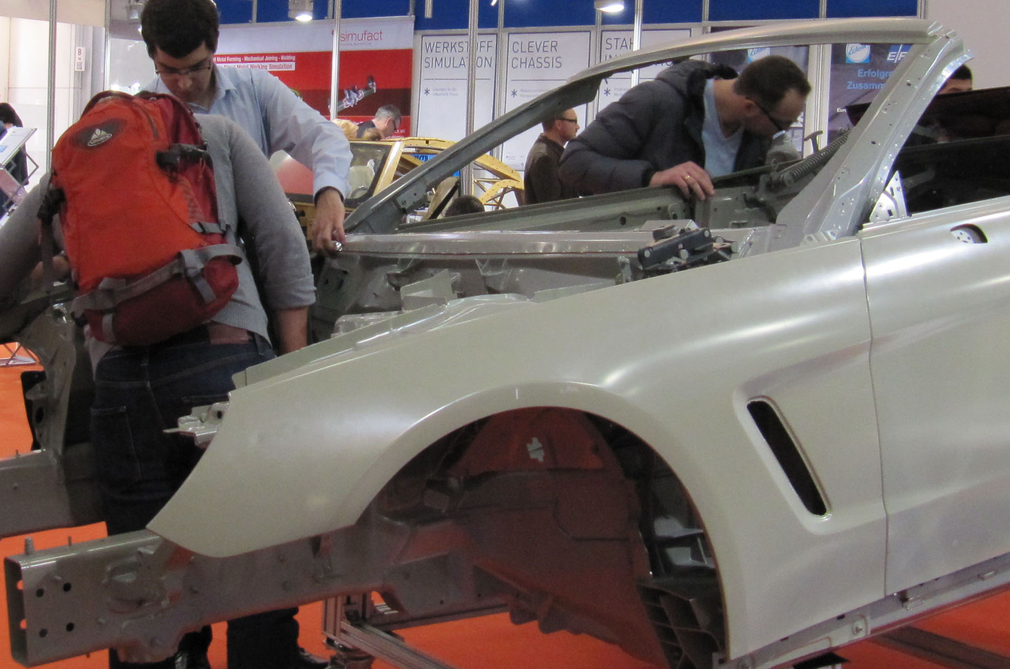 Die am LWF-Stand ausgestellte Rohkarosserie des aktuellen Mercedes-Benz SL Cabrio (Baureihe R231) war immer wieder ein großer Anziehungspunkt, an dem die Besucher die verschiedenen innovativen mechanischen Fügeverfahren direkt am Fahrzeug besichtigen konnten. Die Bauteile und Halbzeuge der Karosserie bestehen aus Aluminiumblech, -guss und -strangpressprofilen sowie Stahlblech und sind mit Clinchen, Halbhohl- und Vollstanznieten, Direktverschrauben, Hochgeschwindigkeitsbolzensetzen und thermischen Fügeverfahren wie dem Rührreibschweißen, teilweise in Kombination mit strukturellem Kleben, gefügt.