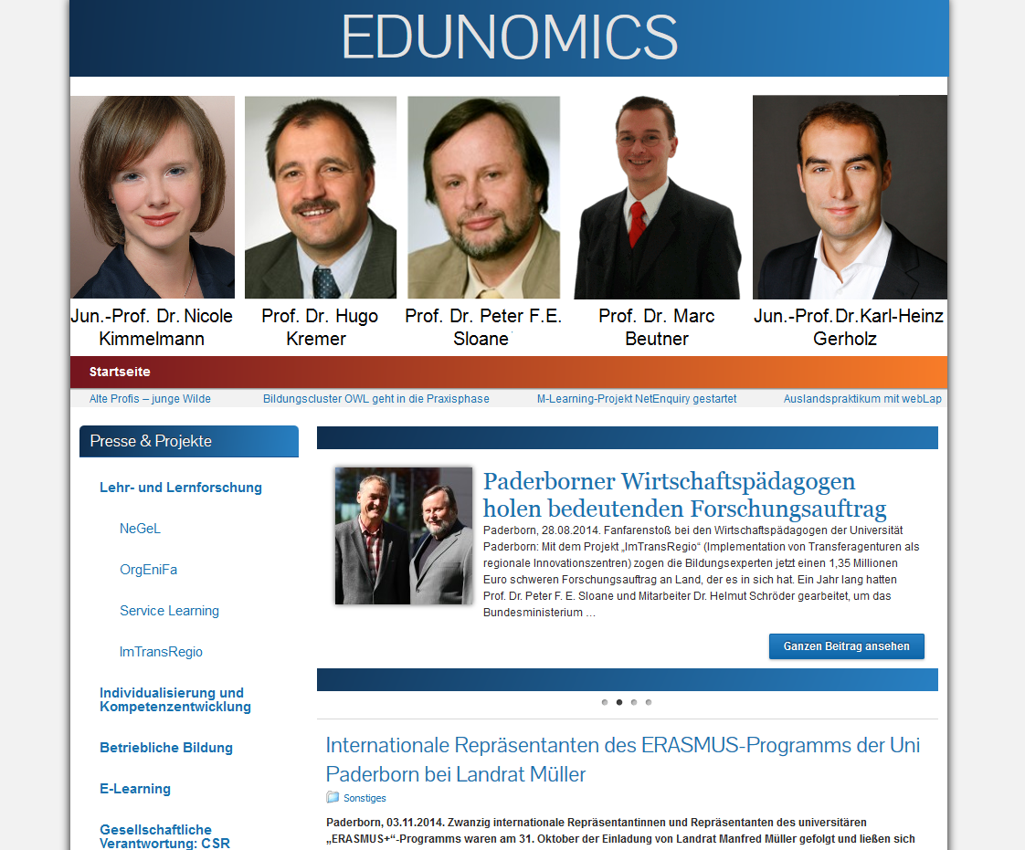 „Moderne Bildungsforschung“, so Departmentsprecher Prof. Dr. F. E. Peter Sloane, „findet nicht mehr hinter universitären Mauern statt, sondern fühlt sich dem berechtigten Interesse der Gesellschaft nach umfassender Information über neue Denkansätze und Modelle verpflichtet.“ Unter EDUNOMICS.de (aus EDUCATION und ECONOMICS) können sich Studierende, Bildungspolitiker, Lehrkräfte von berufsbildenden Schulen, Wissenschaftler und Meinungsmultiplikatoren ab sofort einen raschen Überblick über die Arbeit der fünf Paderborner Professoren Prof. Dr. Marc Beutner, Jun.-Prof. Dr. Karl-Heinz Gerholz, Jun.-Prof. Dr. Nicole Kimmelmann, Prof. Dr. H.-Hugo Kremer und Prof. Dr. Peter F. E. Sloane verschaffen. Sämtliche öffentlich geförderten Projekte sind darin beschrieben und durch aktuelle Informationen wie z. B. Pressemitteilungen zum Thema oder vertiefende Berichte erläutert und beschrieben. Im zu jedem Thema gehörenden Blog können Interessierte fachliche Kommentare abgeben und Fragen stellen.