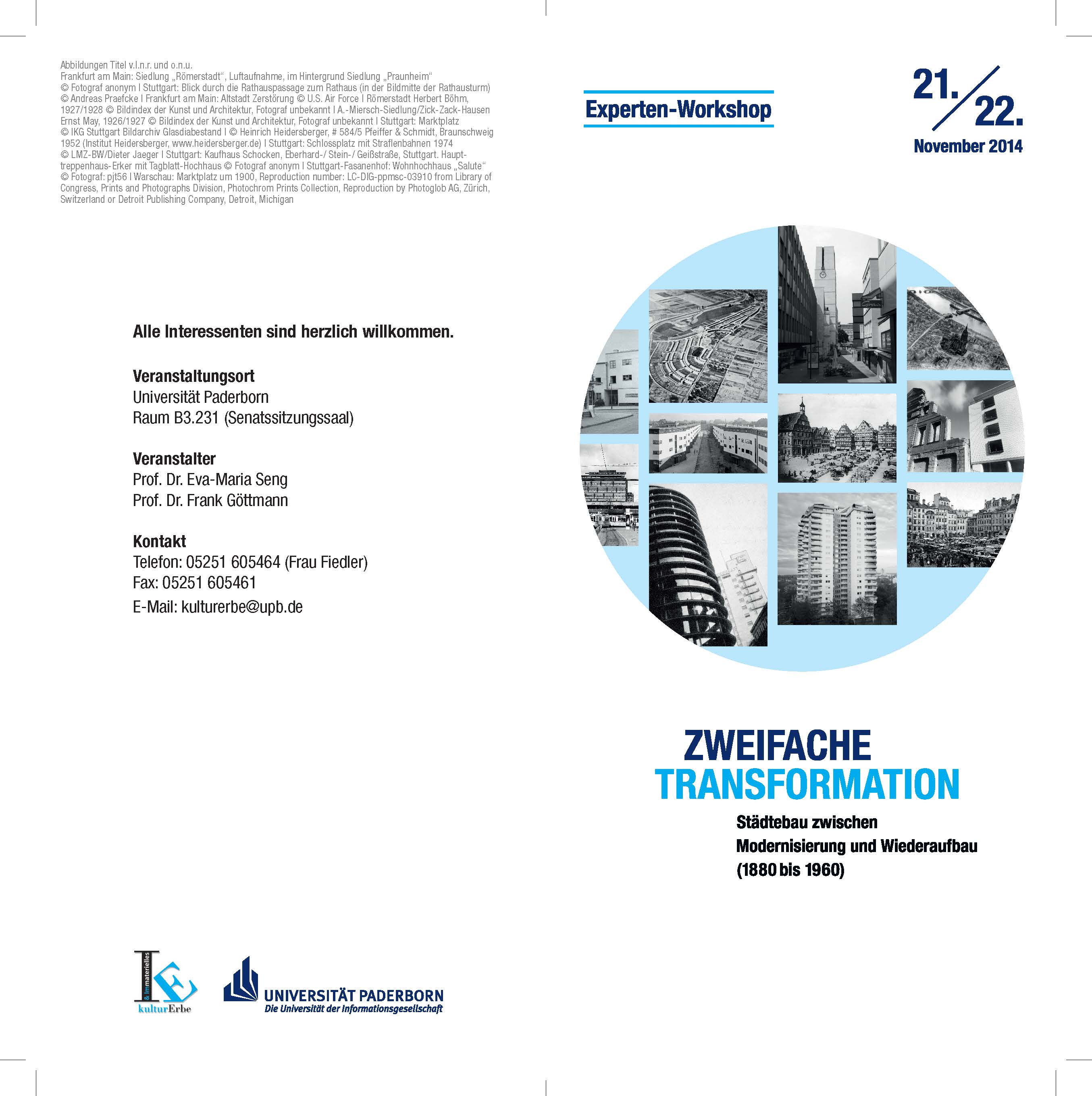Unter dem Titel „Zweifache Transformation: Städtebau zwischen Modernisierung und Wiederaufbau (1880 – 1960)“ findet am 21. und 22. November ab 14 Uhr ein Experten-Workshop des Historischen Instituts der Universität Paderborn statt. Kontakt: Universität Paderborn, Historisches Institut, Tel. 05251-605464, Andrea Fiedler, kulturerbe@upb.de.