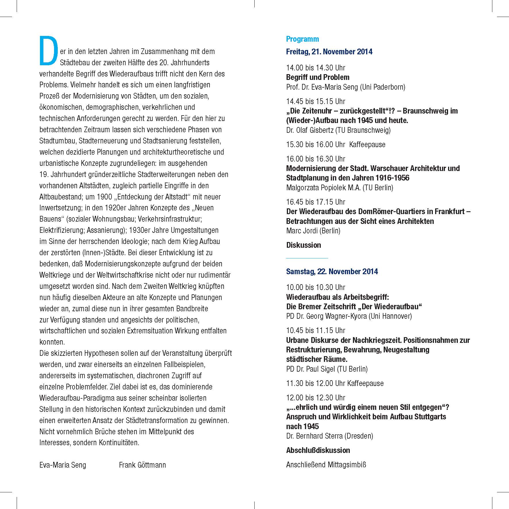 Der Workshop unter Beteiligung von Experten aus der Stadtgeschichte und Denkmalpflege wird veranstaltet von Prof. Dr. Eva-Maria Seng, Lehrstuhl für Materielles und Immaterielles Kulturerbe, und Prof. Dr. Frank Göttmann, Lehrstuhl für Geschichte der Frühen Neuzeit. Im Zentrum der Diskussionen des ganztägigen Workshops soll der langfristige Prozess der Modernisierung von Städten stehen, bei dem die sozialen, ökonomischen, demographischen, verkehrlichen und technischen Anforderungen berücksichtigt werden müssen. Der in den letzten Jahren im Zusammenhang mit dem Städtebau der 2. Hälfte des 20. Jahrhunderts verhandelte Begriff des Wiederaufbaus soll dabei kritisch hinterfragt werden, denn er trifft nicht den Kern des hier aufgeworfenen Problems. Für den zu betrachtenden Zeitraum lassen sich verschiedene Phasen von Stadtumbau, Stadterneuerung und Stadtsanierung feststellen, welchen dezidierte Planungen und architekturtheoretische und urbanistische Konzepte zugrunde liegen. Bei dieser Entwicklung ist zu bedenken, dass Modernisierungskonzepte aufgrund der beiden Weltkriege und der Weltwirtschaftskrise nicht oder nur rudimentär umgesetzt worden sind. Nach dem Zweiten Weltkrieg knüpften nun häufig dieselben Akteure an alte Konzepte und Planungen wieder an, zumal diese nun in ihrer Gesamtheit zur Verfügung standen und angesichts der alle Bereiche tangierenden Extremsituation Wirkung entfalten konnten.