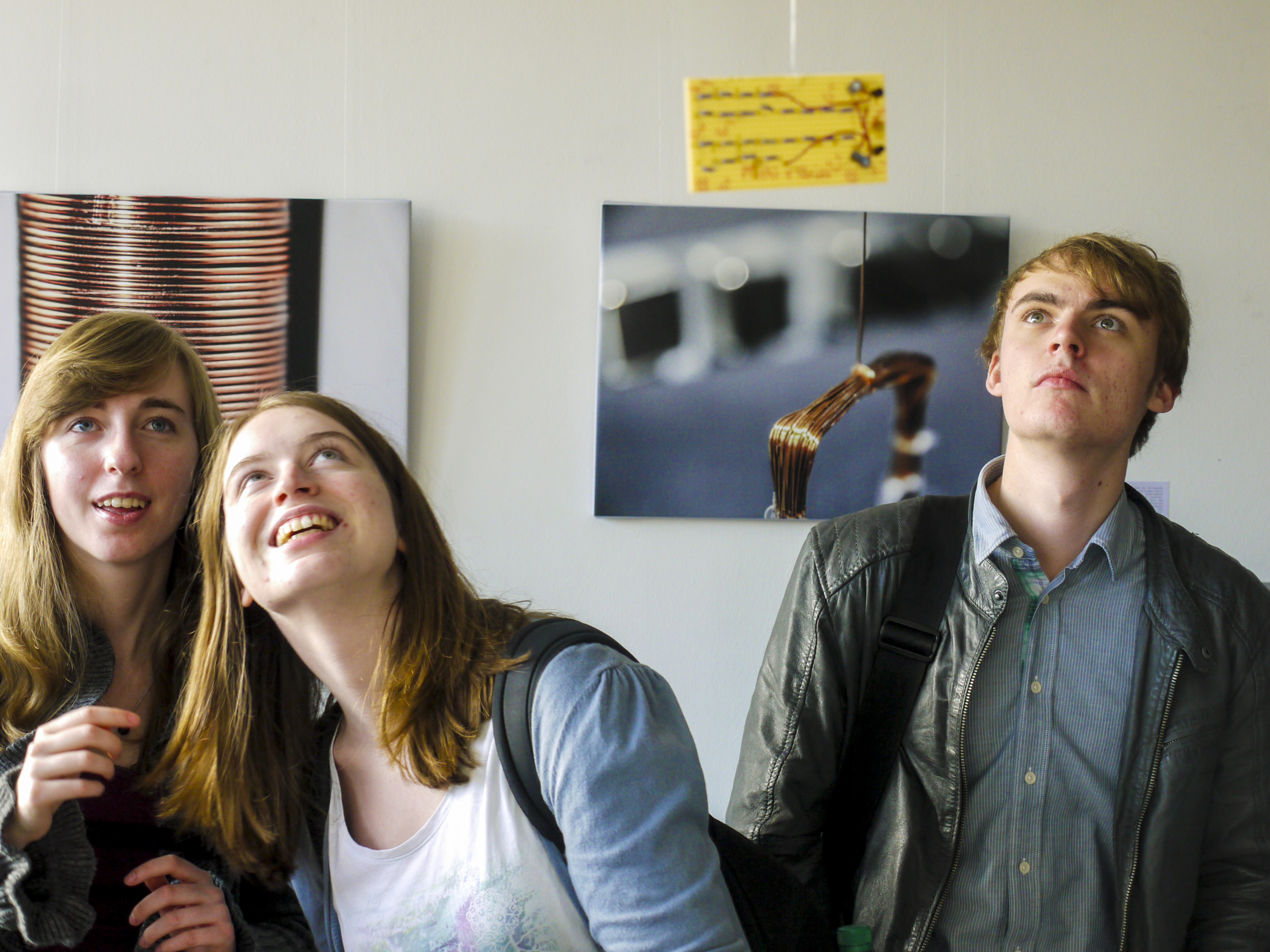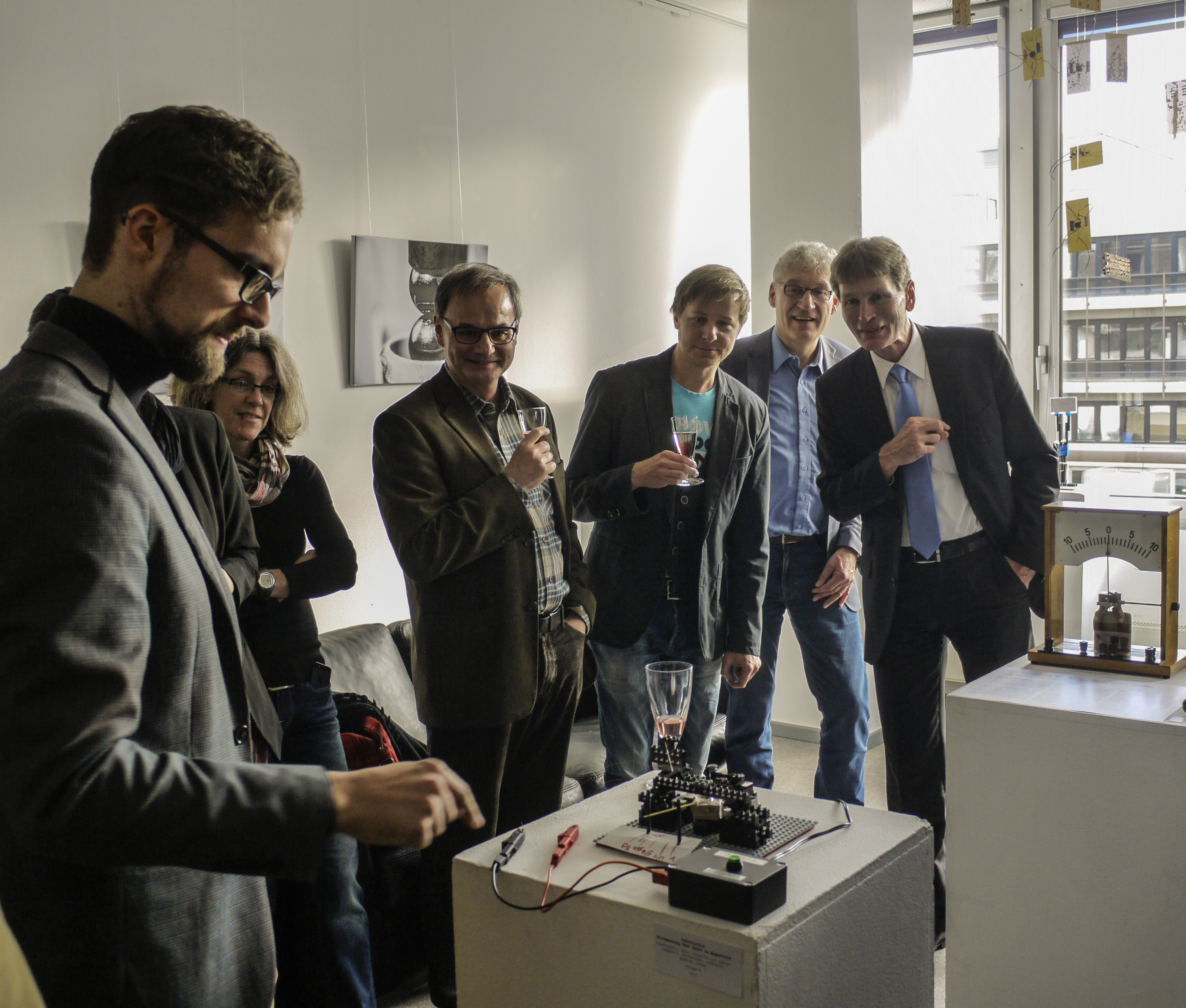 Prof. Dr. Torsten Meier, Dekan der Fakultät für Naturwissenschaften der Universität Paderborn, eröffnete die „etwas andere“ Kunstausstellung „Die Vermessung des Stroms – Funktionale Objekte des Paderborner Physik Praktikums 3P“. Er würdigte die Idee der Ausstellungsmacher, Johannes Pauly, Heike Probst und Dr. Marc Sacher vom Department Physik, dem Publikum die Disziplin Physik und das Konzept des kompetenzorientierten Paderborner Physik Praktikums 3P auf eine ganz andere Art und Weise in Form einer Kunstausstellung zugänglich zu machen. Außerdem hob er die Leistungen der Studierenden, von denen viele zur Vernissage gekommen waren, hervor: „Sie haben bewiesen, wie man mit Teamwork, Fachwissen, technischem Geschick, Kreativität und Freude in einer knapp bemessenen Zeitspanne funktionsfähige Messgeräte bauen kann“, sagte er: „Und Sie sind damit auf einem guten Weg, die Kompetenzen auszubilden, die einen guten Physiker ausmachen.“