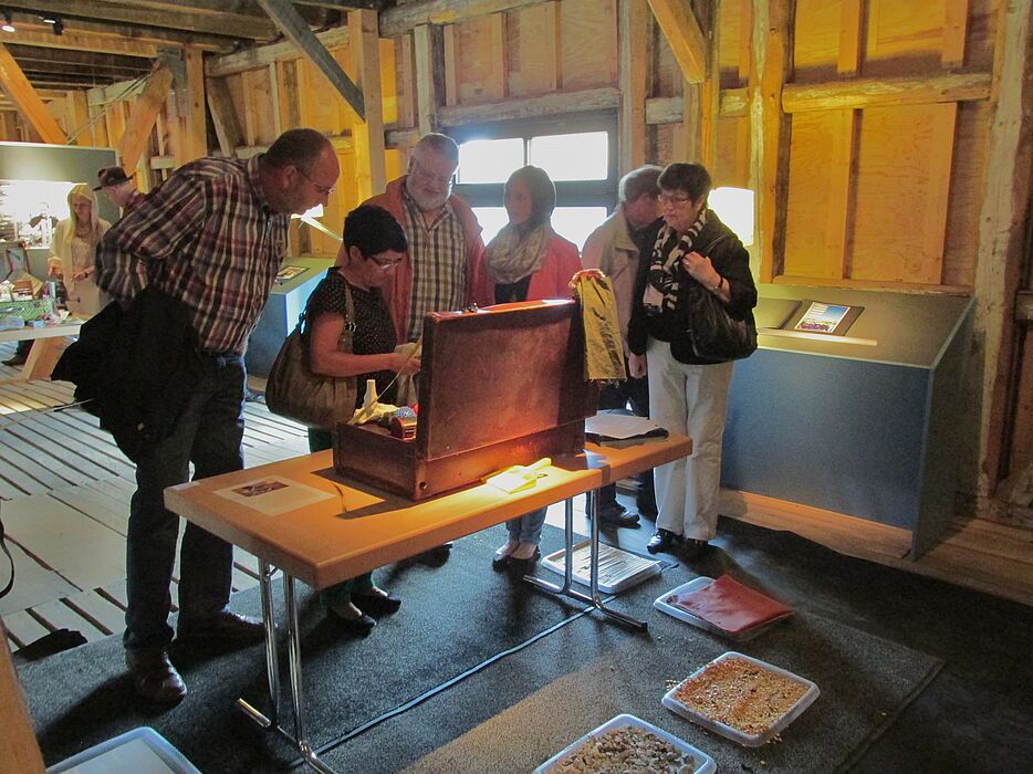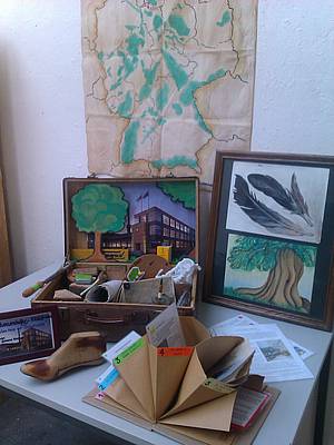 Mit Hilfe eines Landschaftsmodells im Kofferdeckel, einer Landkarte, verschiedenen Werkzeugen und weiteren Gegenständen möchte Simone Kirchner in ihrem Museumskoffer die Holzart der Buche – dem Namensgeber des Fagus-Werks und langjährigen Rohstoff der Schuhleisten – vermitteln und auf deren vielfältige Nutzung hinweisen.