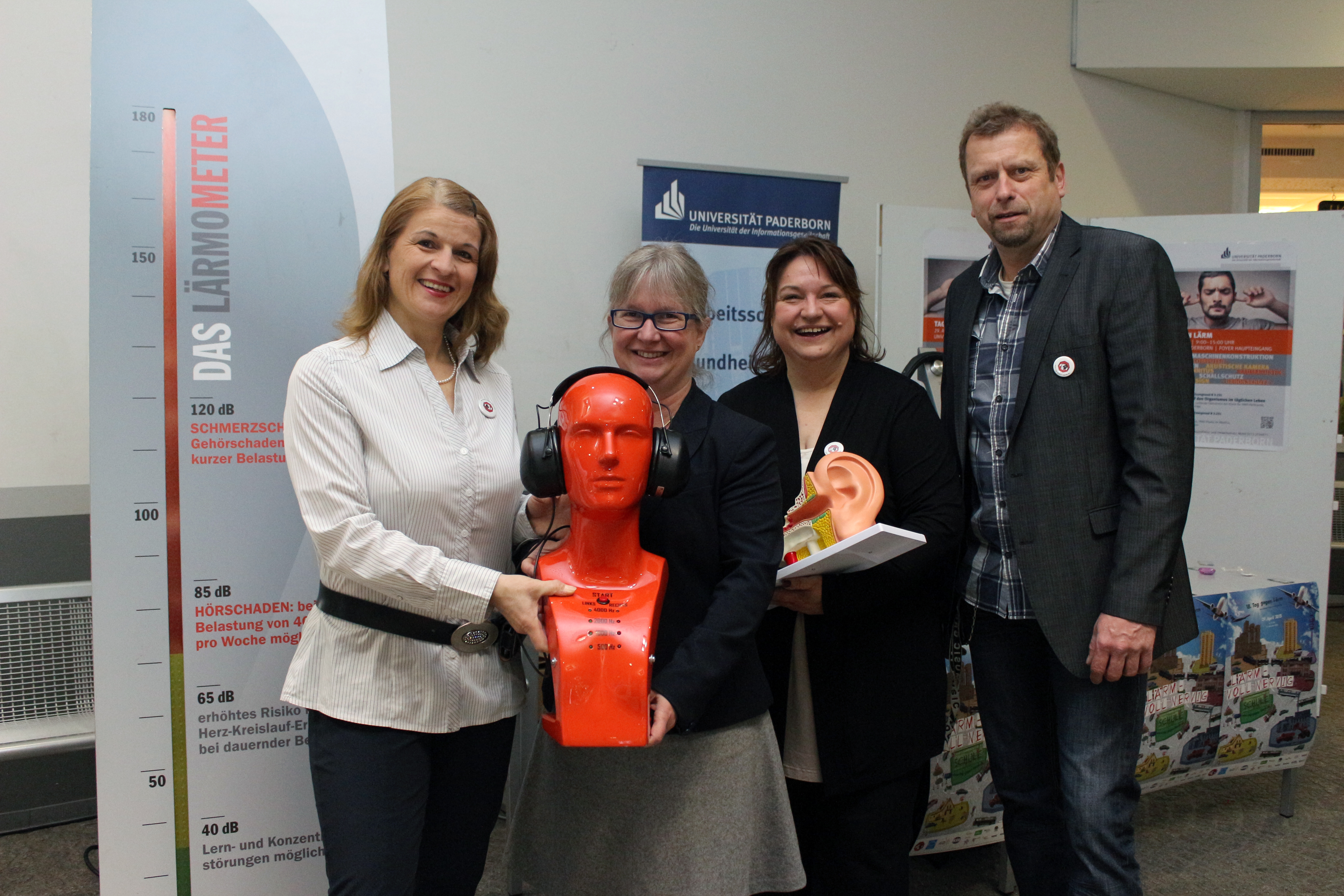 Foto (Universität Paderborn, Heiko Appelbaum): Diana Riedel, Simone Probst, Sylvia Moore und Martin Hohrath (v. l.) freuten sich über das große Interesse am Tag gegen Lärm.